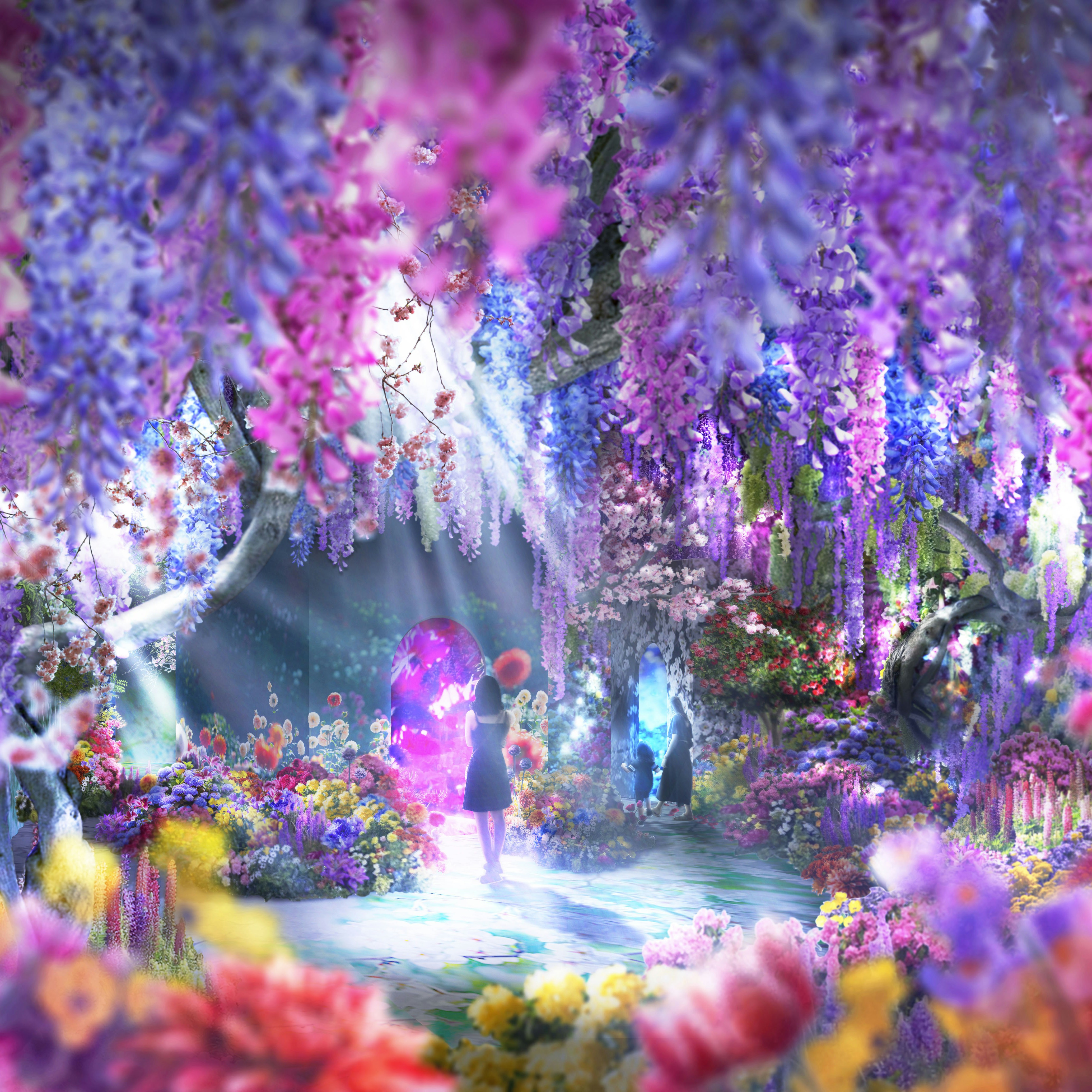 例えば、最高天高15メートルのドーム型天井全面を使って大型の映像作品《Flashing before our eyes》が来場者を迎え、動と静、生と死、緊張と緩和など対となる概念が走馬灯のように現れる。上下左右、鑑賞者の視界一面を埋めつくす花々の様子を、映画のセット技術を活用して迫力のある空間で体験できる《Intersecting Future》や、包み込まれるようなクッションに寝転び、天井に投影された映像を鑑賞する《Blooming Emotions》、光によって日常の未来への対峙が感じられる《Embracing Lights》なども展示される。