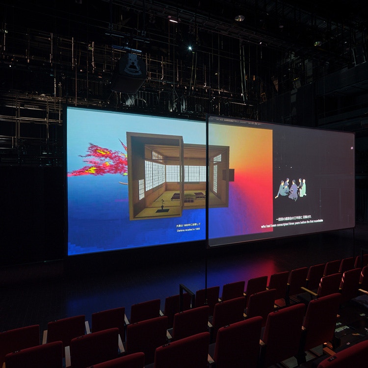 また、近年日本で制作した作品からは、山口情報芸術センター[YCAM]とのコラボレーション作品《ヴォイス・オブ・ヴォイド—虚無の声》(2021)を展示。VRと6面の映像で構成された本作では、西洋主義的近代の超克を唱え、大東亜共栄圏建設について考察した京都学派の哲学者たちの対話、テキスト、講演などが現出。VRでは、戦争の倫理性と国家のための死についての議論が行われた座談会から、西田幾多郎の「無」の概念を象徴する抽象的空間まで、京都学派の思想と哲学者たちの主観性を体現する空間に没入することができる。