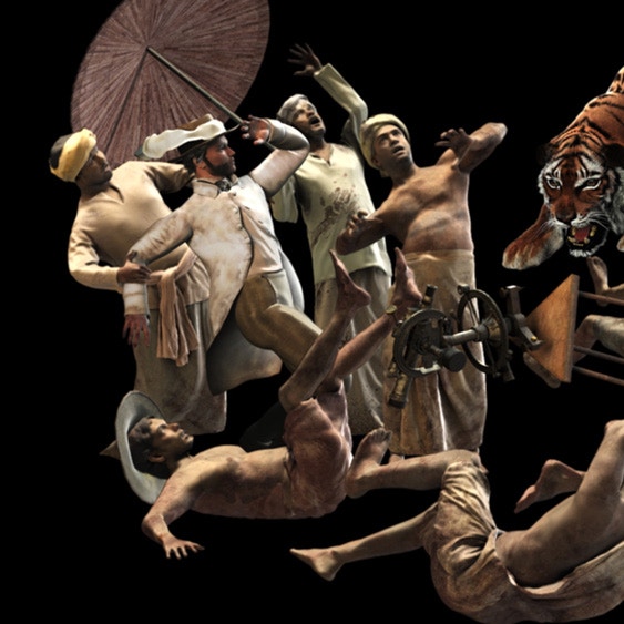 3Dアニメーションを用いた《一頭あるいは数頭のトラ》(2017)は、トラを人間の祖先とする信仰や人虎にまつわる神 話をはじめ、19世紀にイギリス政府からの委任で入植していた測量士ジョージ・D・コールマンとトラとの遭遇や、第二次世界大戦中、イギリス軍を降伏させ「マレーのトラ」と呼ばれた軍人・山下奉文など、シンガポールの歴史における支配と被支配の関係が、姿を変え続けるトラと人間を介して語られる。
