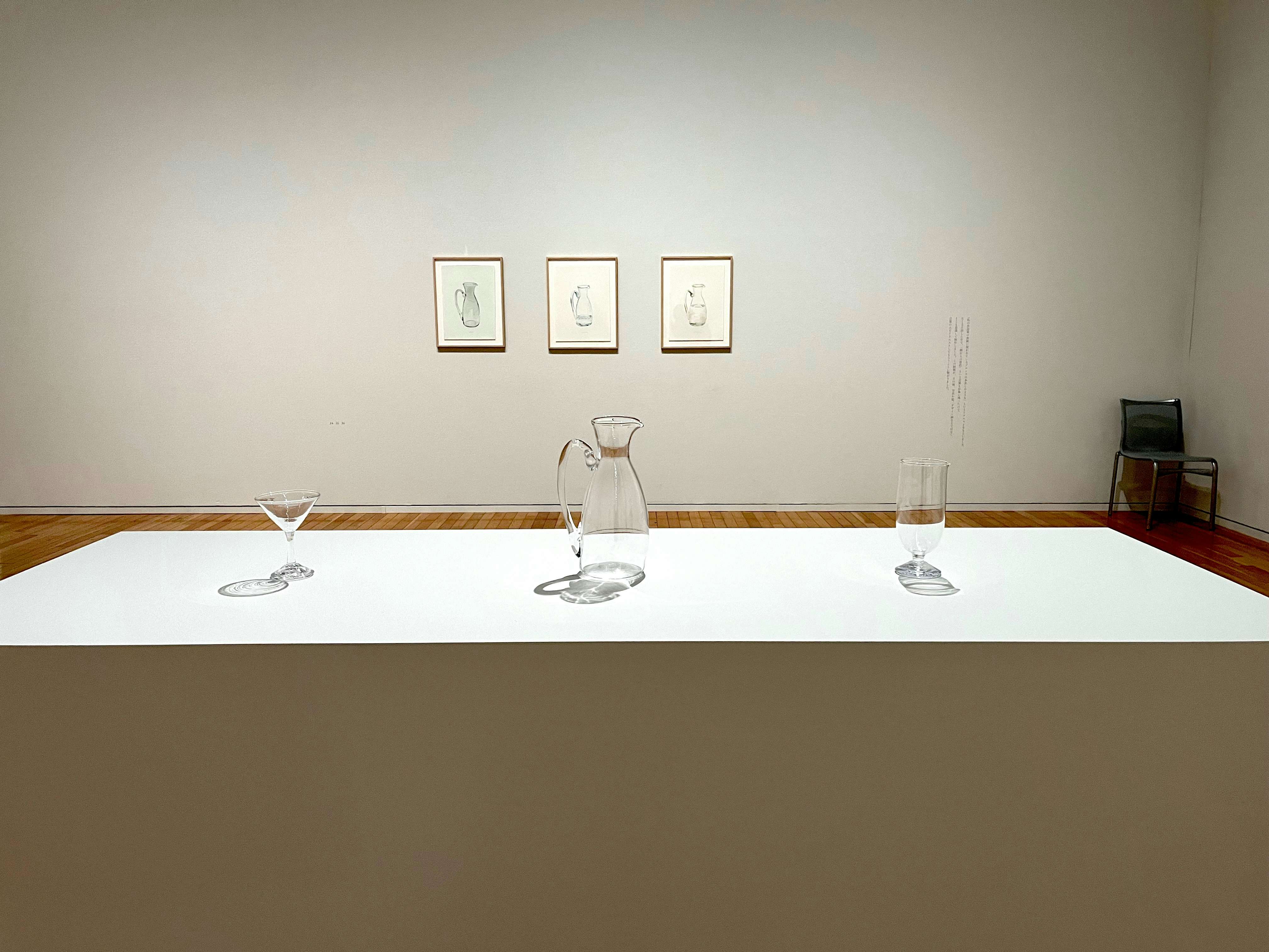 展示風景より、手前が山野アンダーソン陽子のガラス作品、奥が小林且典の絵画