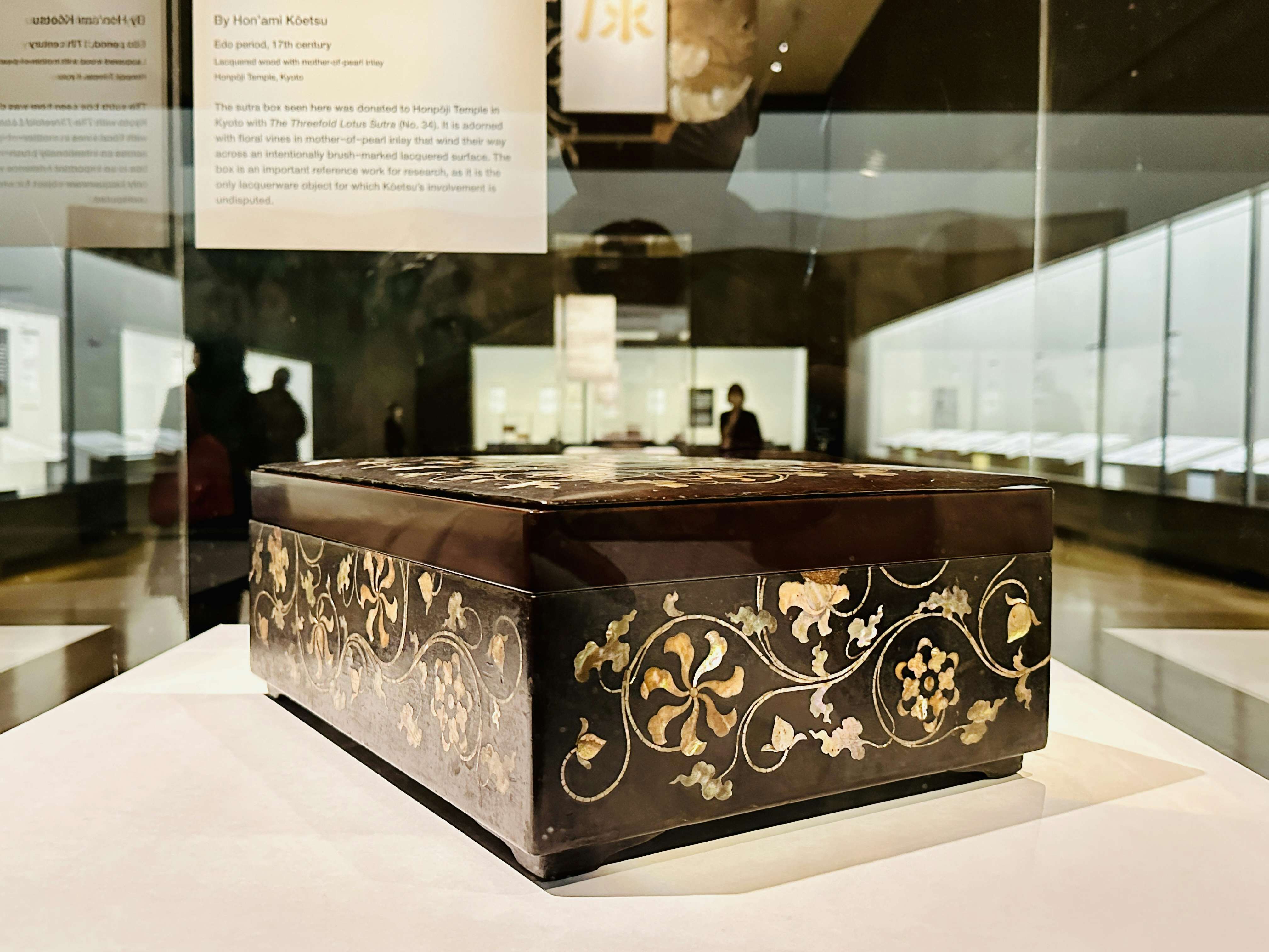 展示風景より、本阿弥光悦作の重要文化財《花唐草文螺鈿経箱》(江戸時代、17世紀)