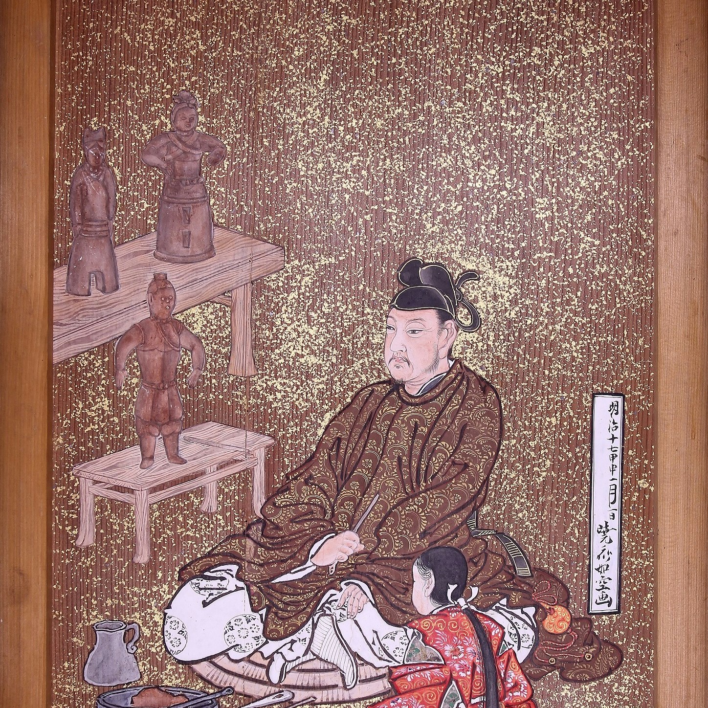 当初は上代の考古資料として、服飾や生活を知るうえでの手がかりとなっていたハニワだが、1940年の皇紀2600年を目前に埴輪の美そのものが着目されるようになっていく。また、ハニワは日中戦争の勃発もあり、大陸からの仏教伝来以前の「日本人の心」を取り戻そうとする運動に組み込まれていく。本章で展示される都路華香《埴輪》(1916)は、明治天皇の伏見桃山陵の造営という、近代初の古墳事業のために新作の埴輪をつくったことに影響を受けたと思われる作品。また、埴輪が神的存在としてあしらわれたスポーツ競技会のメダルなども紹介される。さらに戦時中、蕗谷虹児が倒れた航空兵を抱いて雄叫びを上げる古代の武人を描いた《天兵神助》(1943)は、戦意高揚のためにハニワの表象が使われた典型的な例といえるだろう。