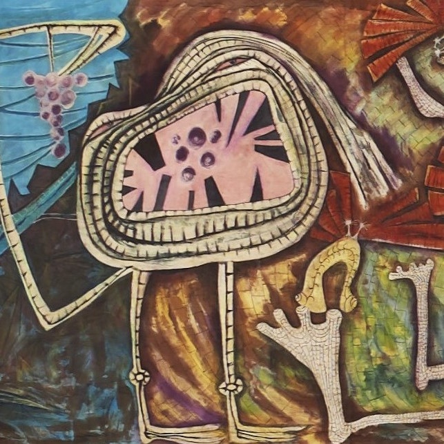 さらに本章では、ろうけつ染めによって描かれた全幅13.5メートルの芥川(間所)紗織による先史時代や神話モチーフとした大作や、コラージュの名手である桂ゆきによって、縄文時代の顔面把手付き土器が引用された《人と魚》(1954)なども紹介される。
