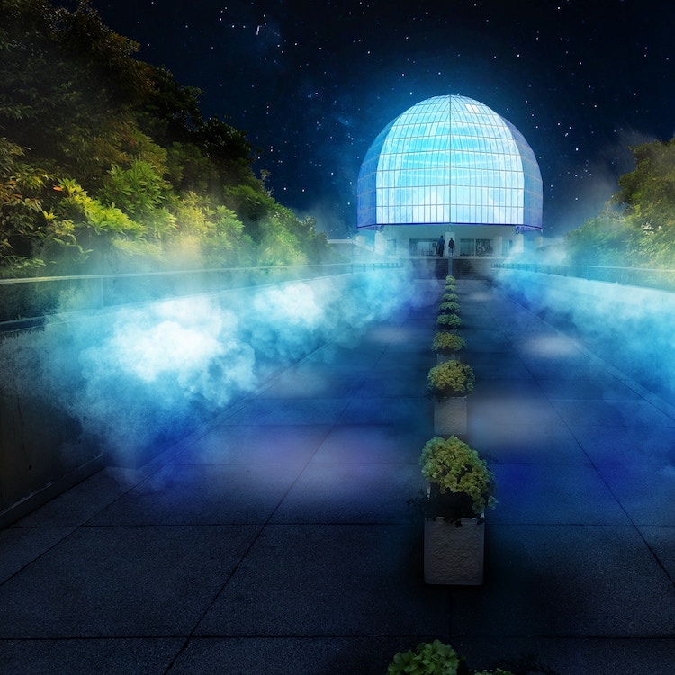 会場となるのは葛西臨海水族園と葛西臨海公園。谷口吉生の設計による葛西臨海水族園では、「海とつながる」をテーマとして、水族園を象徴するガラスドームをミストが包み込み、海とつながる世界を生み出す演出を実施。