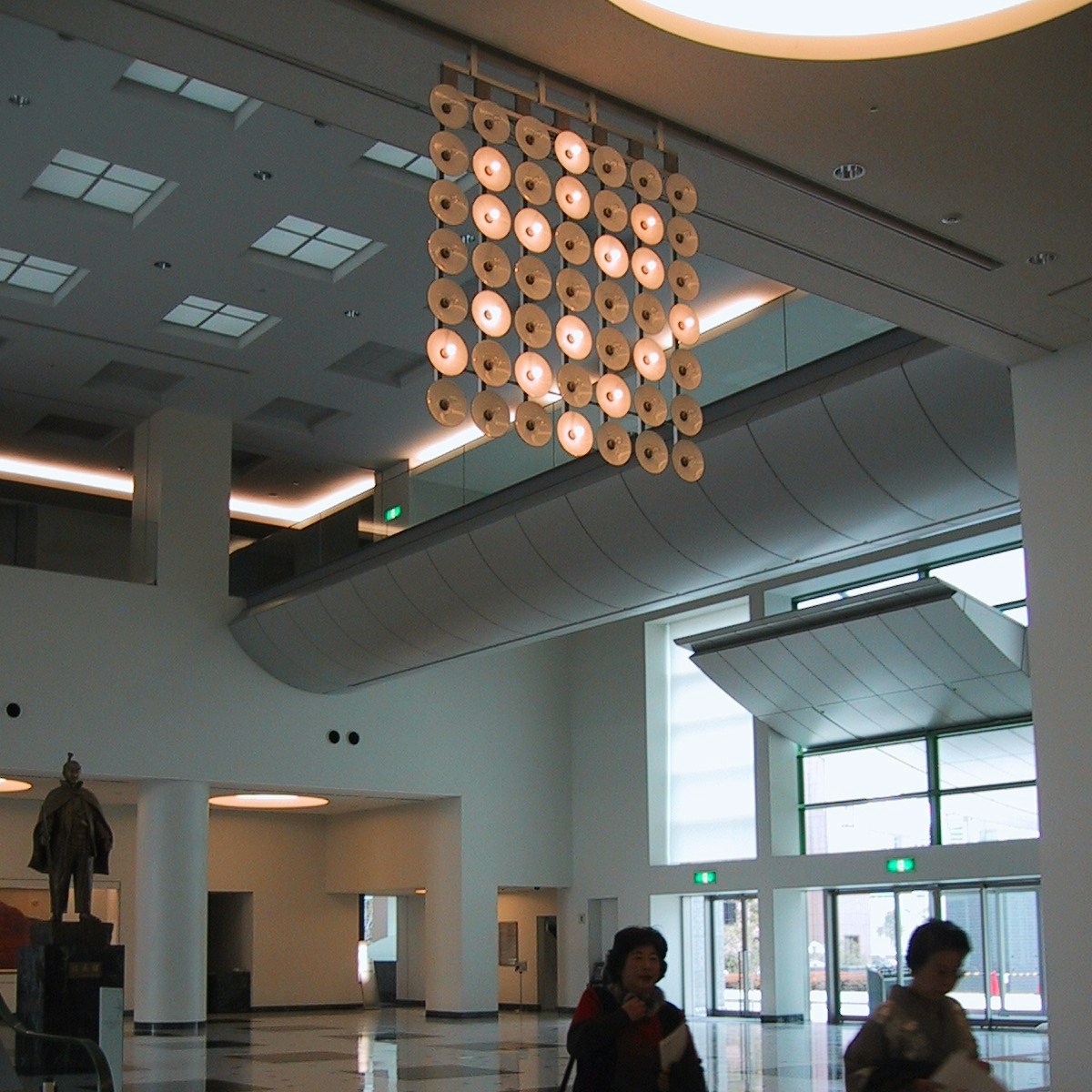 情報産業の拠点として1996年にオープンしたソフトピアジャパンセンタービルに設置されていた藤幡正樹《Light on the Net》は、インターネットを介してコミュニケーションをする作品だ。