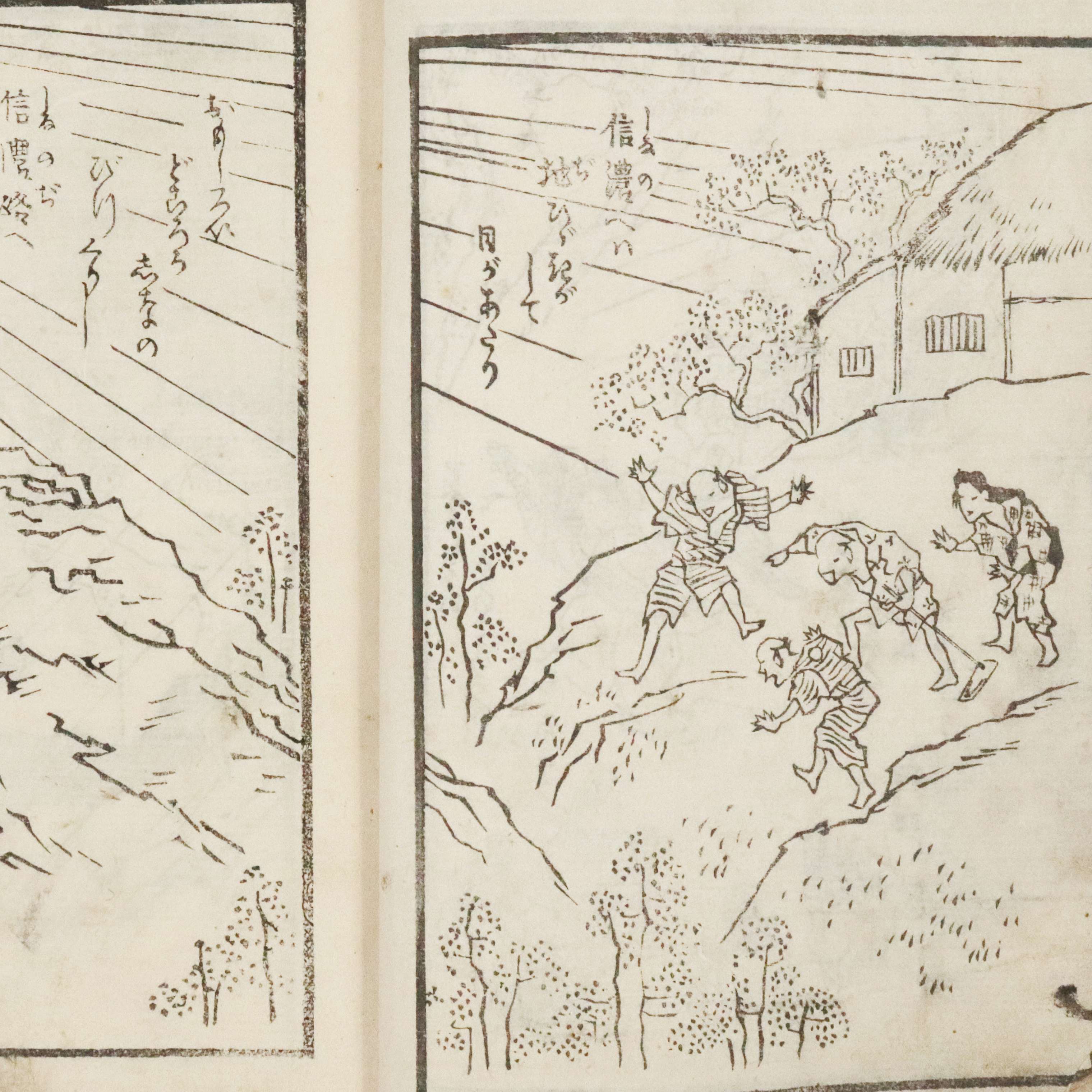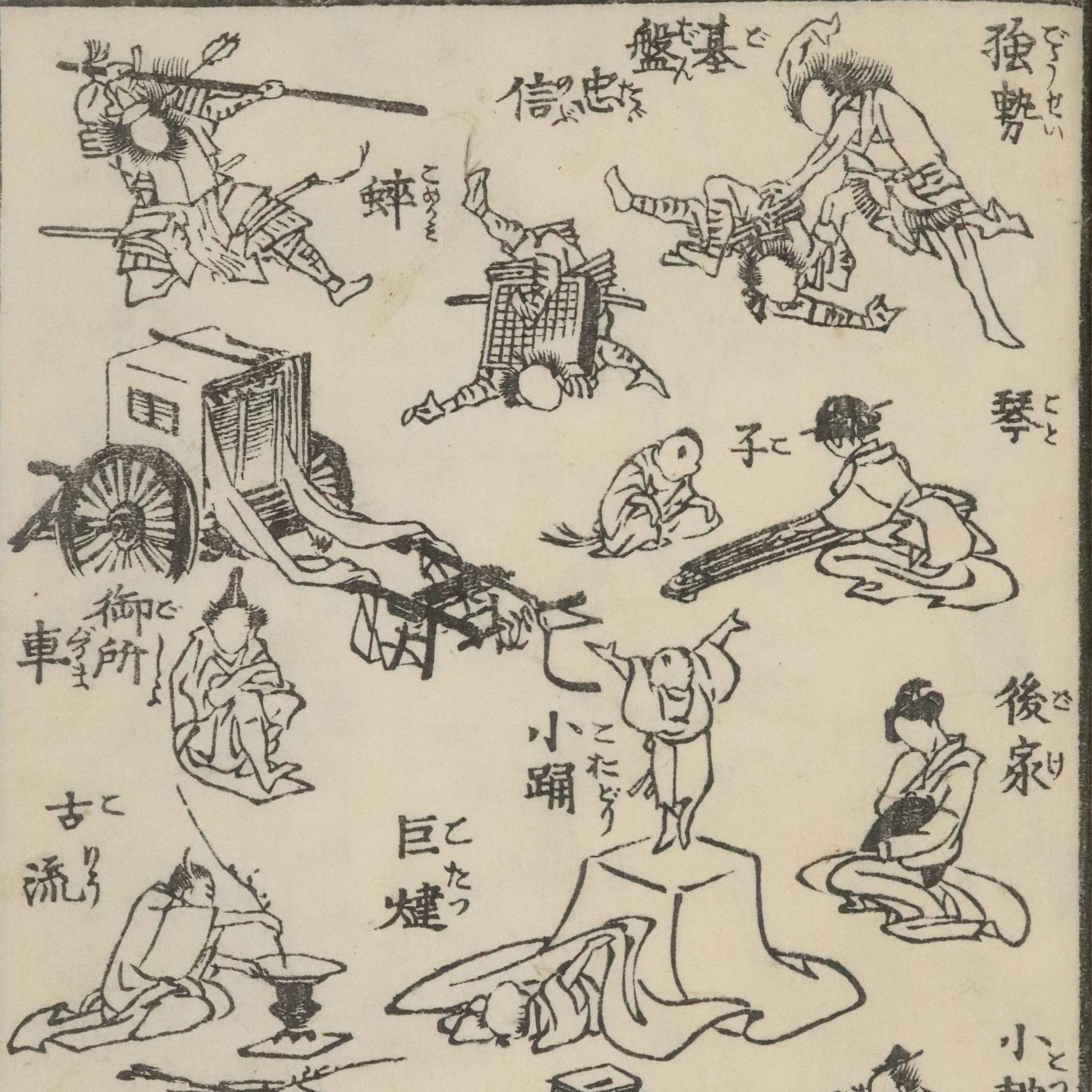 本展では、館蔵の版本作品を中心に、北斎が描いた略画による人物や動物、草花のモチーフを紹介する。略画においては、細部を省略しつつも、対象の特徴や動きが失われることなく、いきいきとした印象を与える。展示される作品は、小さなモチーフが集まって1ページを構成し、賑やかで魅力的な世界をつくり出している。訪れた人々は、個々のモチーフをじっくりと楽しんだあと、全体の画面を眺めてその魅力を再確認することができるだろう。