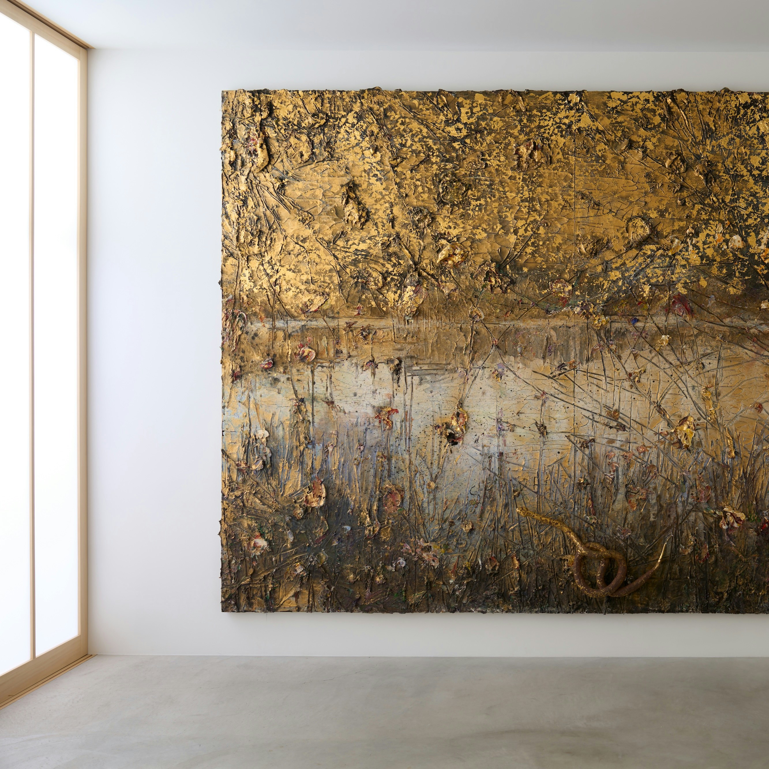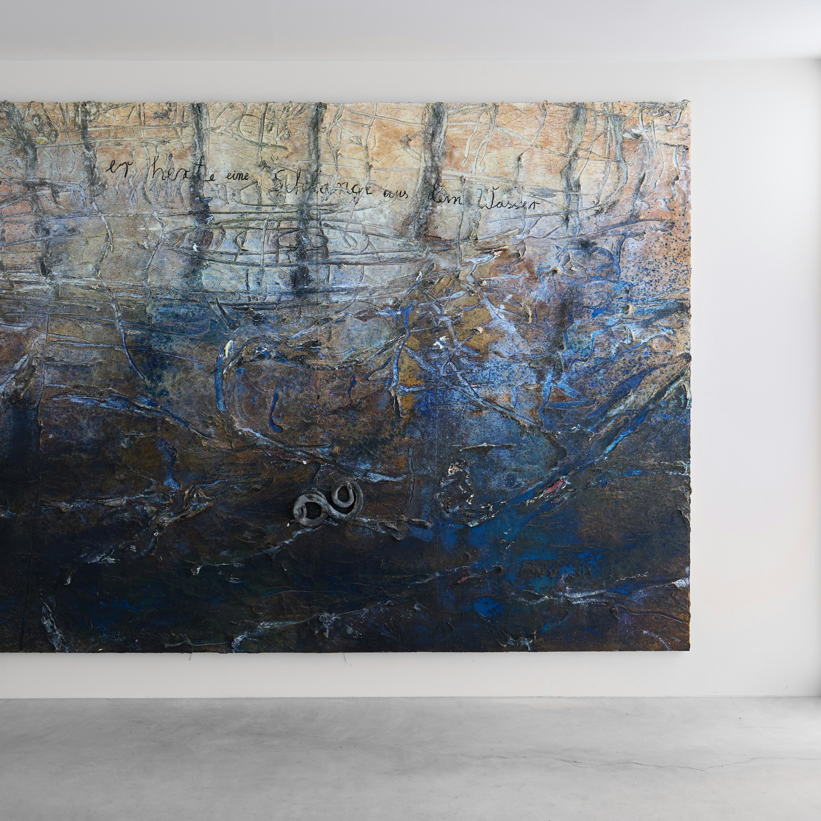 二条城での展覧会の準備期間中、キーファーはとくに2つの絵画《E. T. A. ホフマンのために》(2015-24)と《er hexte eine Schlange aus dem Wasser》(2016)に強い関心を抱き、それらの呼応に心を惹かれたという。これらの絵画では、静かな水面に映る牧歌的な風景と蛇の彫刻が描かれており、金、ウルトラマリン、黄土色、柔らかな白が使われている。ファーガス・マカフリー東京の展示空間において、自然光が差し込むなかでこれらの作品が共鳴し、独特の美しい雰囲気をつくり出している。
