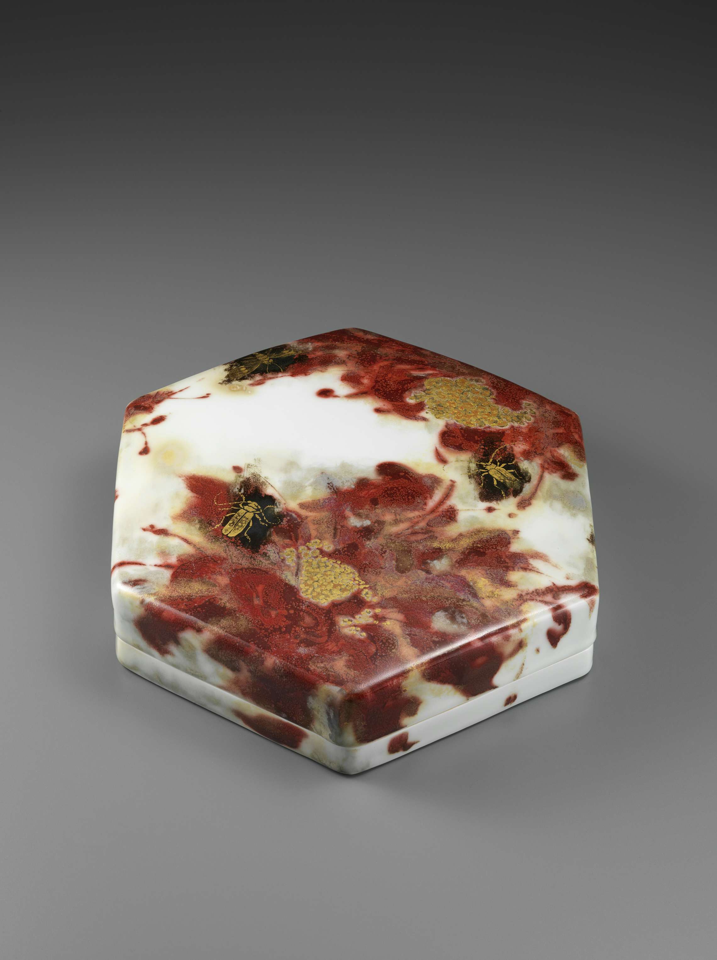 藤本能道 霜白釉釉描色絵色彩花と虫図六角大筥 1990