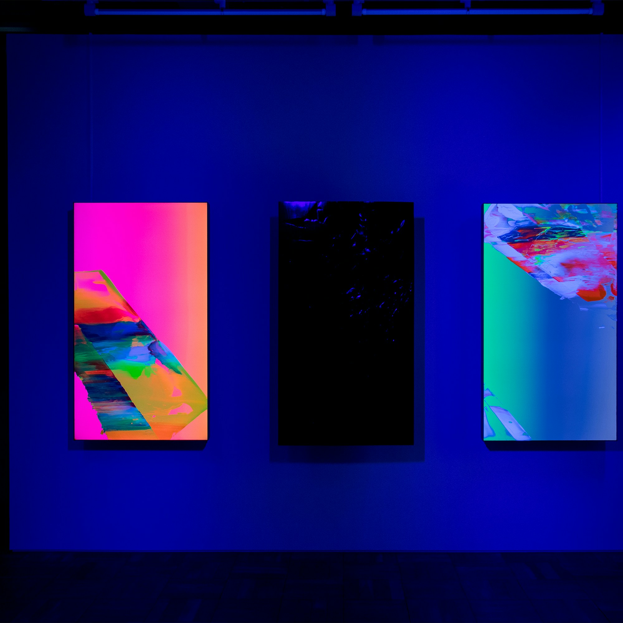 一貫して「光」に関心を向けて制作を行っているQue。ものを見るという行為は、光を条件に成立しているにもかかわらず、私たちは光そのものを見ることはできない。Queの作品は、蛍光塗料やブラックライト、明滅するディスプレイなどを用いることで、光そのものを強烈に意識させる。