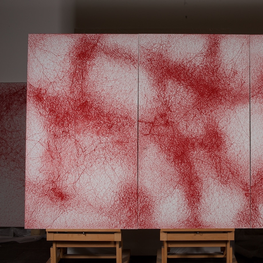 本展では、生と死という人間の根源的な問題に向き合い、「生きることとは何か」「存在とは何か」を探求してきた塩田が、すべて新作で会場を構成。グレーに塗られたキャンバスと白い糸を用いた「Night Sky」や、赤い糸を使った「Endless Line」といったシリーズのほか、船をモチーフにした立体作品などを展示。また、近年制作を試みているブロンズ作品のなかから、家族の手をモチーフにした作品も発表する。