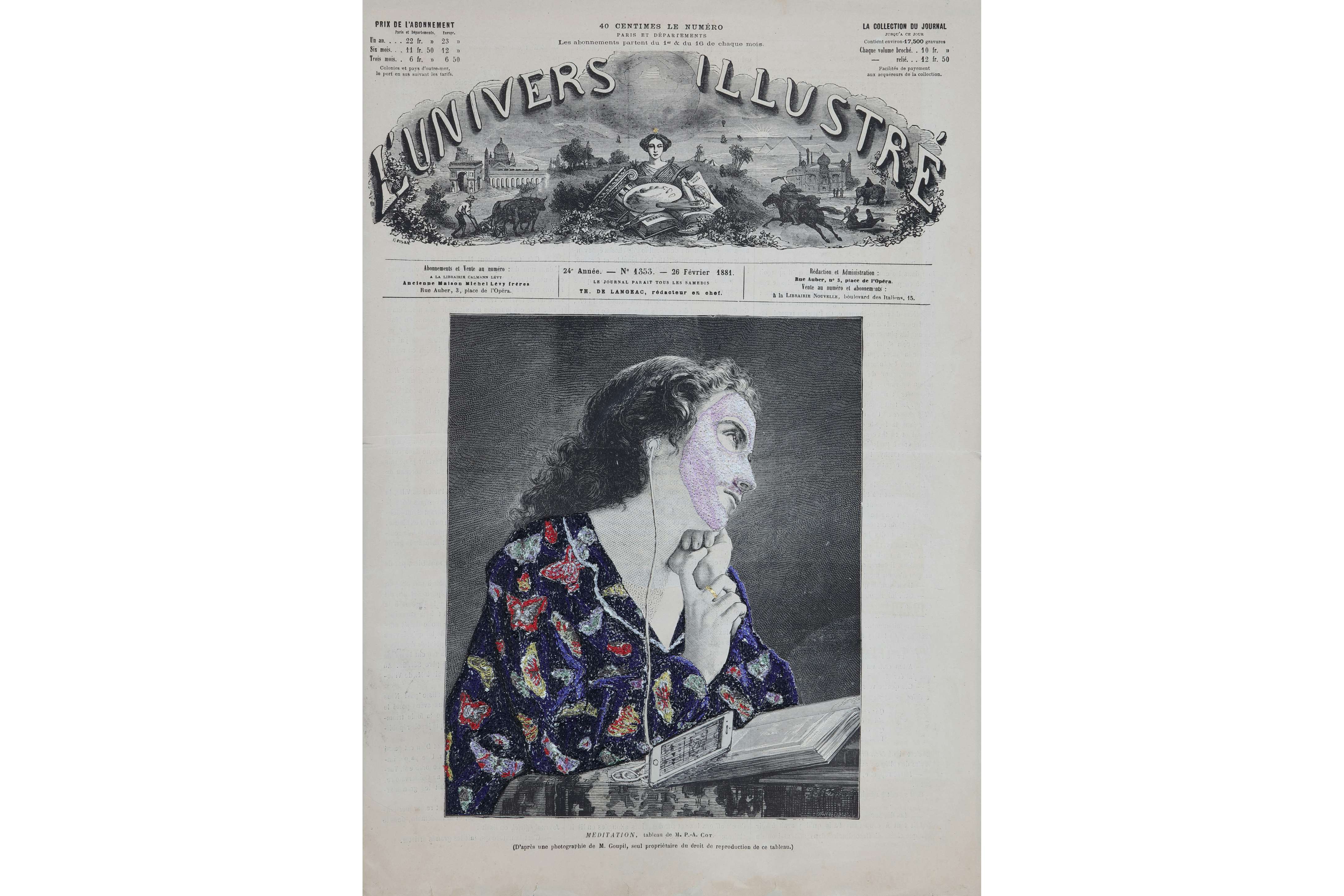 青山悟 News From Nowhere (Miranda) 2017 ビンテージプリントに刺繍 撮影=宮島径 © AOYAMA Satoru Courtesy Mizuma Art Gallery