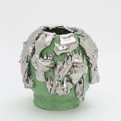 陶芸の伝統技術に基づきながらも、ファッションやダンスからインスピレーションを受け、独自の素材や配色で茶碗を制作している桑田卓郎(1981〜)。その活動領域は陶芸にとどまらず、2015年には大型彫刻作品シリーズを発表するなど、表現の幅を広げている。