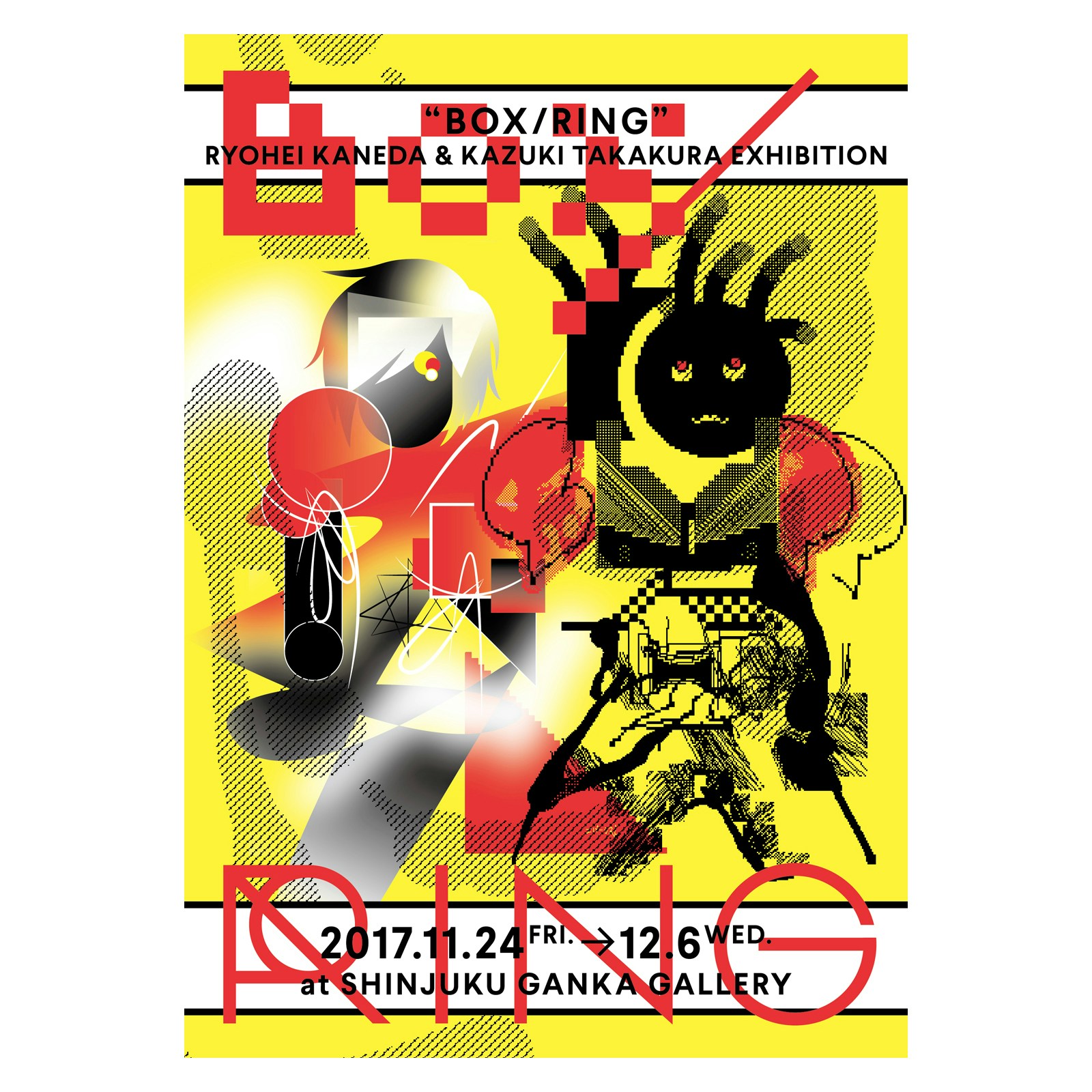 ともにデジタルグラフィックを表現手段とする金田遼平とたかくらかずきが、二人展「BOX/RING」を開催中。それぞれIllustratorとPhotoshopのみを使用し、制限時間など独自のルールのもとで制作した作品を展示する。会期は12月6日まで。