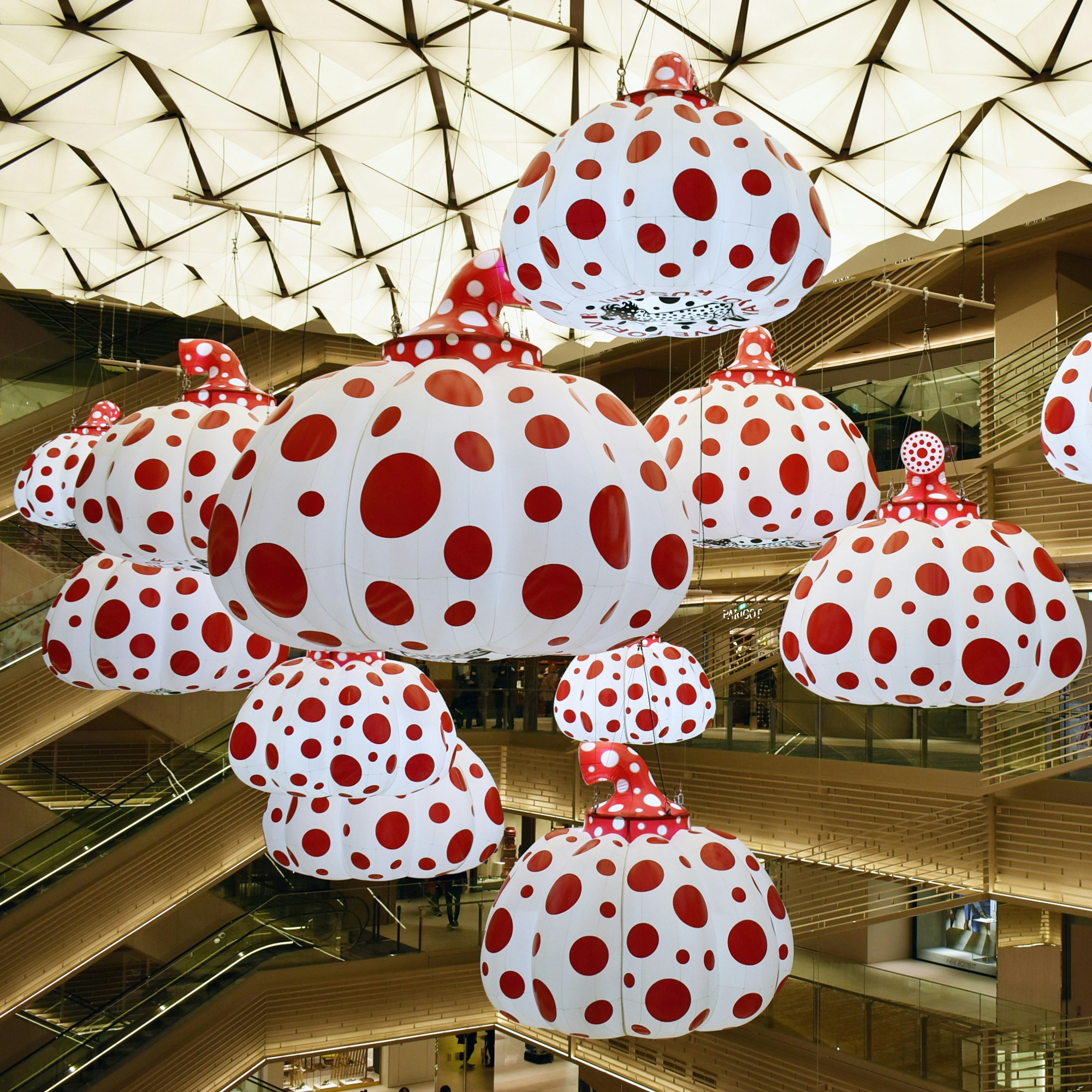 なかでも「インスタ映え」する作品として一躍大きな注目を集めてきたのが、草間彌生のバルーンインスタレーション《南瓜》だ。3種類14個からなる巨大カボチャが、シャンデリアのように吊り下げられているのを目にした人も多いだろう。この作品は当初より常設展示ではないことが明らかにされてきたが、3月21日をもってついに展示終了となることが発表された(再展示の予定はなし)。