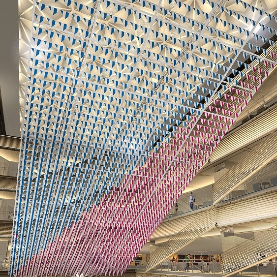 4月2日から展示されるのは、《Like a flock of starlings: work in situ》と題された新作。約9メートル×約19メートルという巨大な本作は、ダニエル・ビュレンのトレードマークである8.7センチのストライプ模様を旗に用いたもの。赤と青の計1500枚の旗によって構成されており、GINZA SIXを彩る(〜10月31日)。