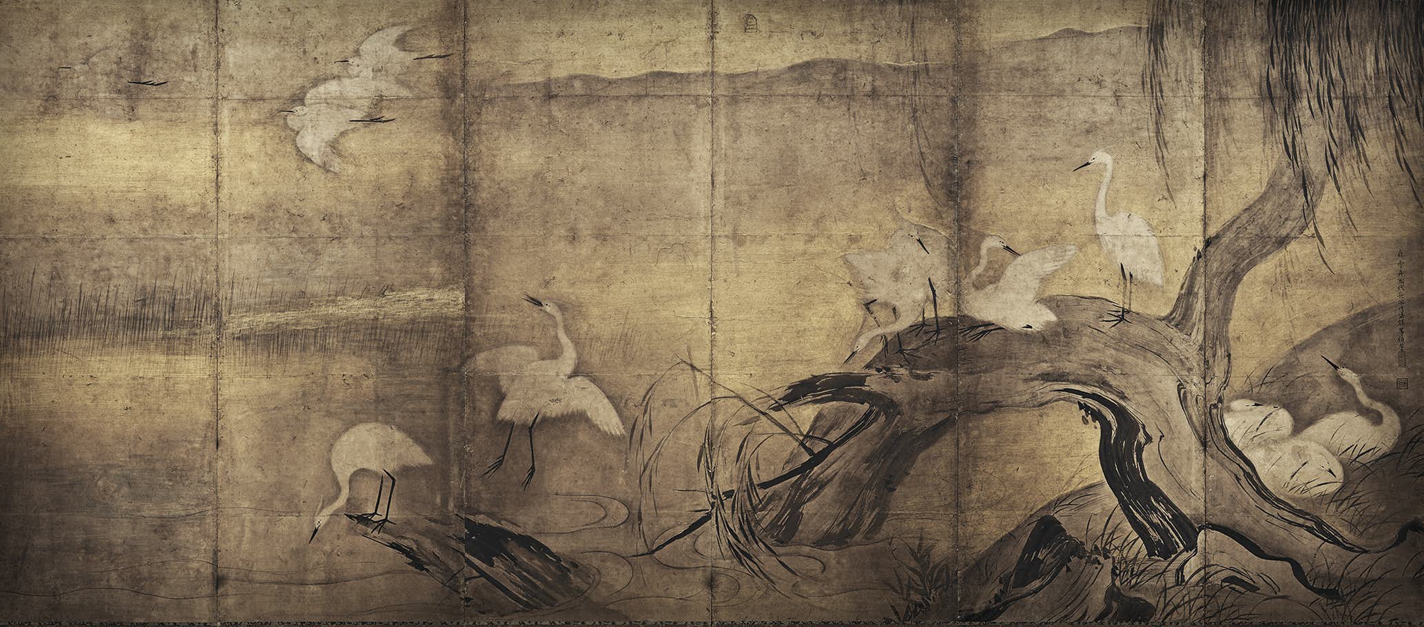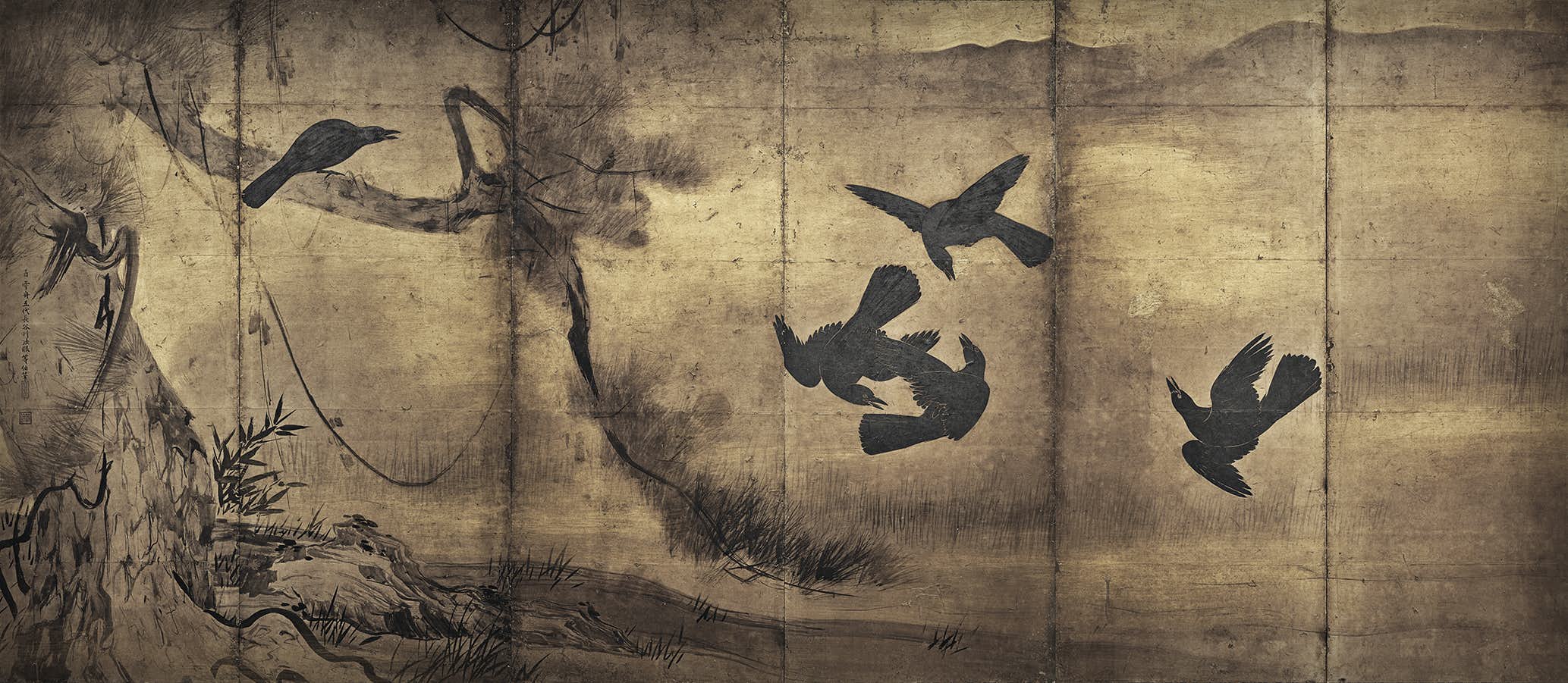 長谷川等伯 烏鷺図屏風 慶長10(1605)以降 紙本墨画 各154x354cm重要文化財Photo by YASUNARI KIKUMA
