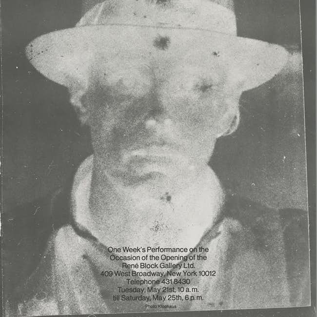 2015年にはアイ・ウェイウェイとともに、欧州各国の難民政策を批判するパフォーマンスをロンドンで行ったカプーア。本作は、ヨーゼフ・ボイス(1921〜1986)が74年の初渡米の際に発表した《I Like America and America Likes Me》(私はアメリカが好き、アメリカは私が好き)のポスターを引用したもの。同作でボイスは、ニューヨークのルネ・ブロック画廊で5日間をコヨーテと過ごした以外、アメリカの街や人々を一切見ずに帰国するというパフォーマンスを行った。