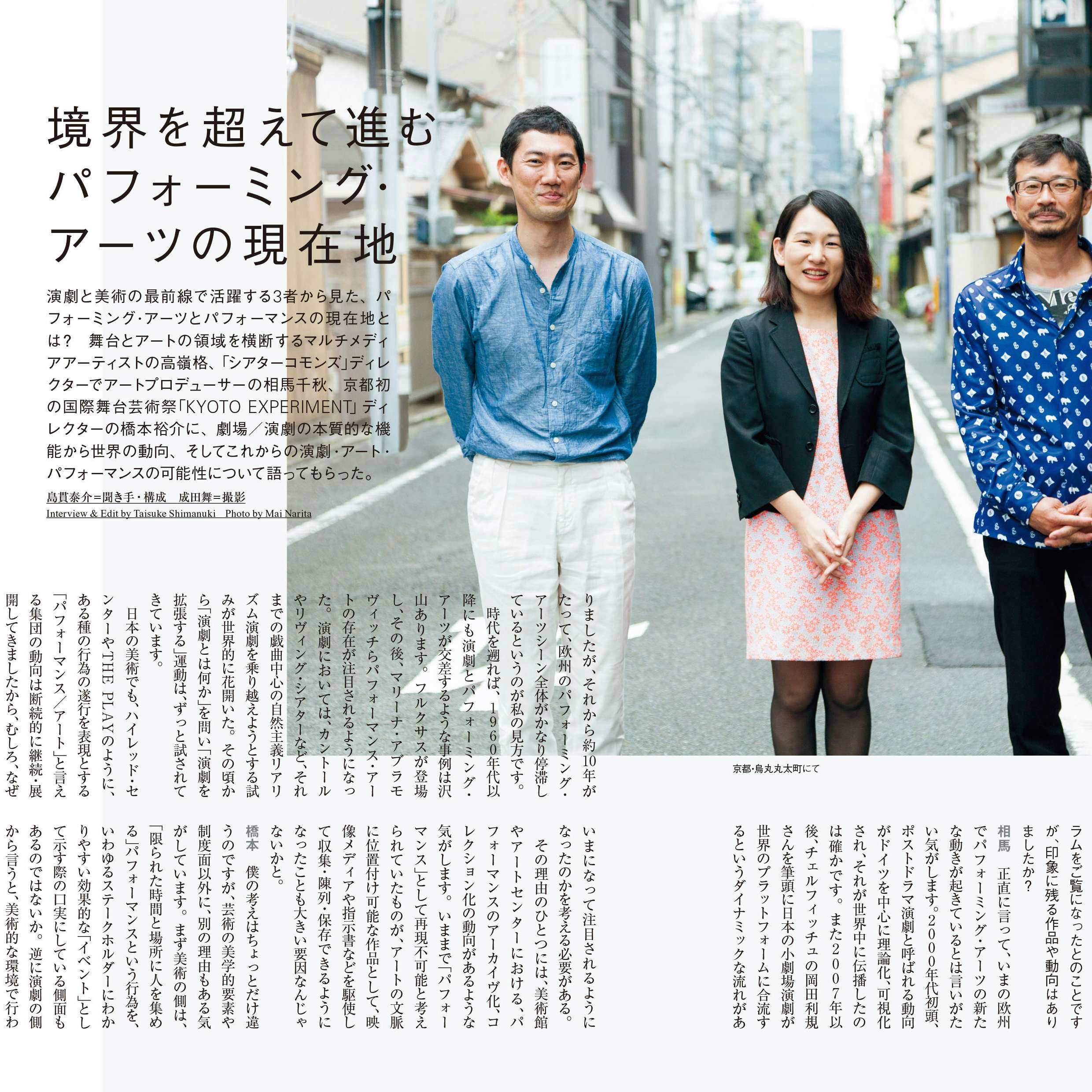 PART3では、演劇とアートの境界を超えて活動するアーティストの高嶺格、「シアターコモンズ」ディレクターの相馬千秋、「KYOTO EXPERIMENT」ディレクターの橋本裕介の鼎談を実施。国内、ヨーロッパ、アジアまで、パフォーミング・アーツのいまを語り尽くす。