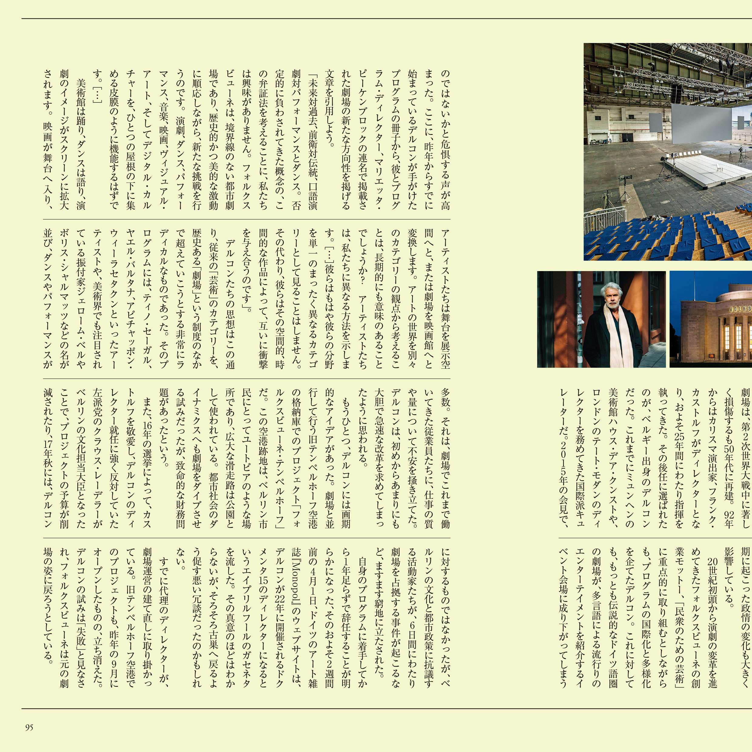 さらに、国際舞台芸術ミーティング(TPAM)のディレクターなどを務めるドラマトゥルクのマックス=フィリップ・アッシェンブレナーはヨーロッパ演劇の傾向を論じるほか、美術史家および美術批評のクレア・ビショップによる、美術館におけるダンスを論じる論文の抄訳(翻訳=大森俊克)を掲載。