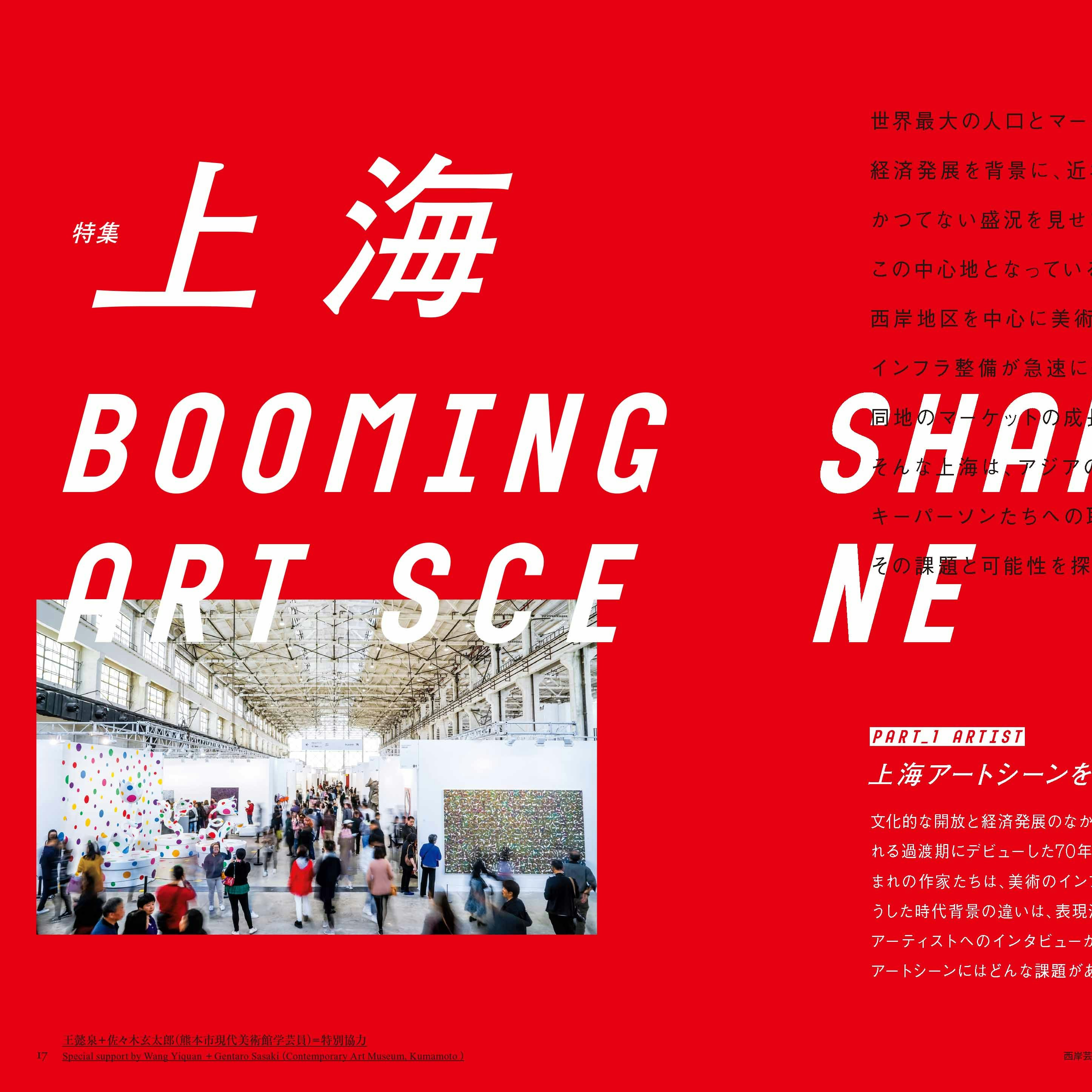 本特集では、この西岸に近年ギャラリーををオープンしたギャラリストたちに取材。ShanghART、AIKE、オオタファインアーツなどに、なぜいま上海なのか、その魅力を聞いている。また、龍美術館やユズ・ミュージアムなど、上海のほとんどの美術館は、個人コレクターや企業によるもの。記事では若手コレクターと企業コレクターへのそれぞれインタビューを通して、中国コレクターの熱量を伝えている。