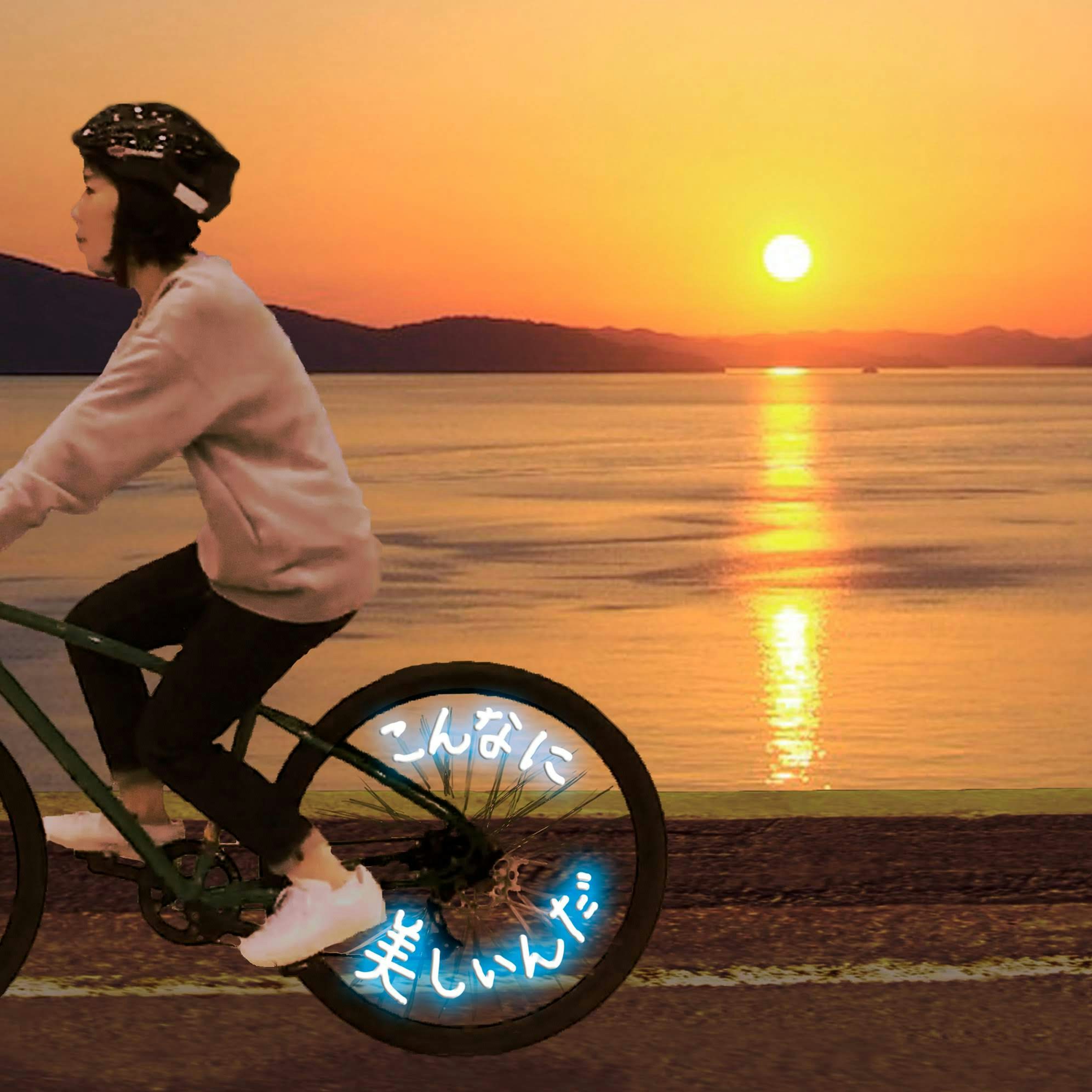 また、山下麻衣+小林直人は、「世界はどうしてこんなに美しいんだ」という言葉が自転車の車輪に光って浮かぶ自転車に乗り、夕日の沈みゆく瀬戸内の海を背景に走るインスタレーション作品を発表。古書店を模した読書ラウンジも併設する本作では、鑑賞者に「世界の美しさ」を考察する時間を与える。