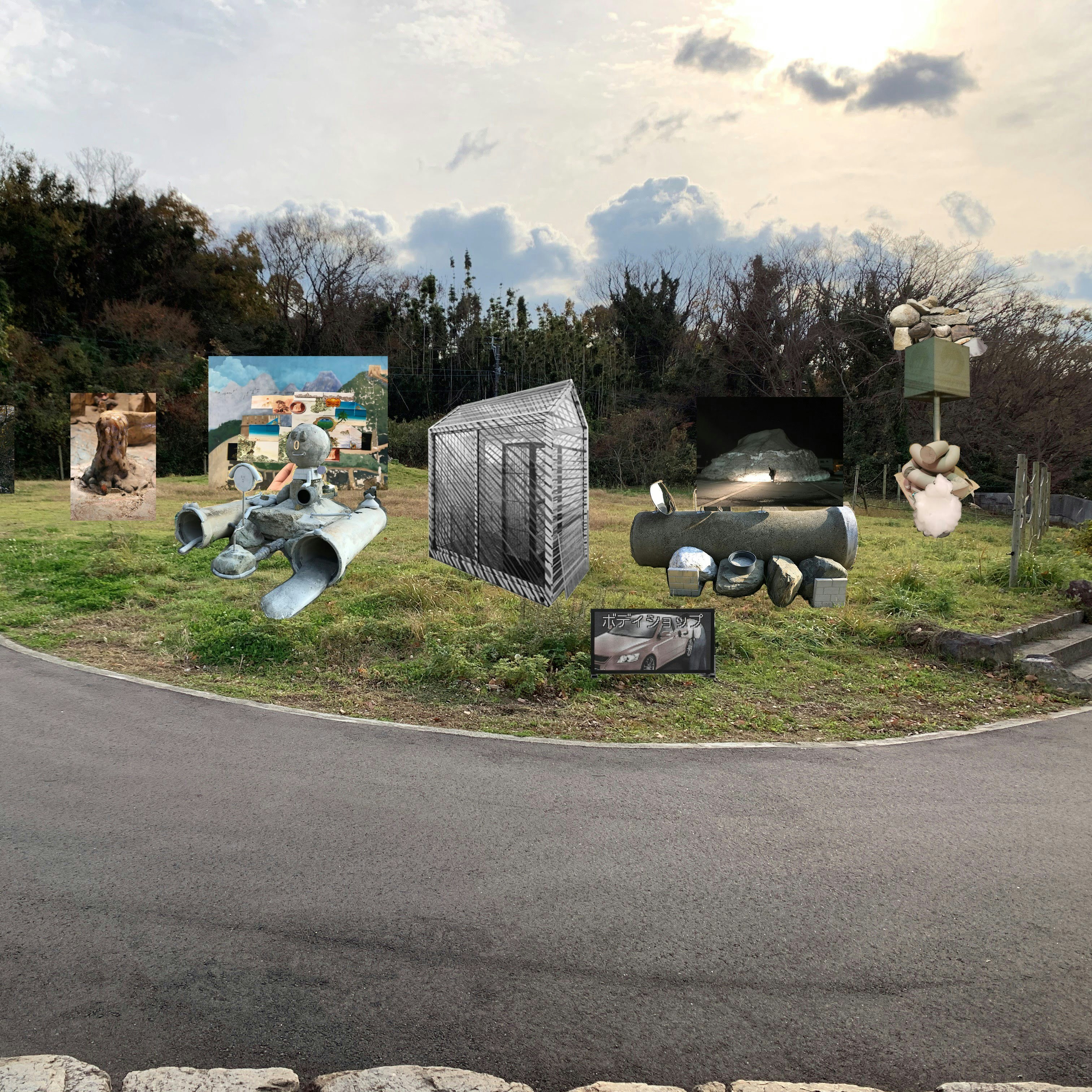 プラスチック製品や雑誌の切り抜き、おもちゃなど身の回りの物を収集し、コラージュ的手法で作品を制作する金氏徹平は、大型看板型の作品写真、屋島から見える採石場の石と建材の破片を使った彫刻、木と水道管を接続した彫刻などによるインスタレーション作品を発表。《S.F(Smoke and Fog)》と題されたこの新作は、屋島や、そこから見える瀬戸内の風景、人為と自然のかたちや空間の関係性などから着想したという。