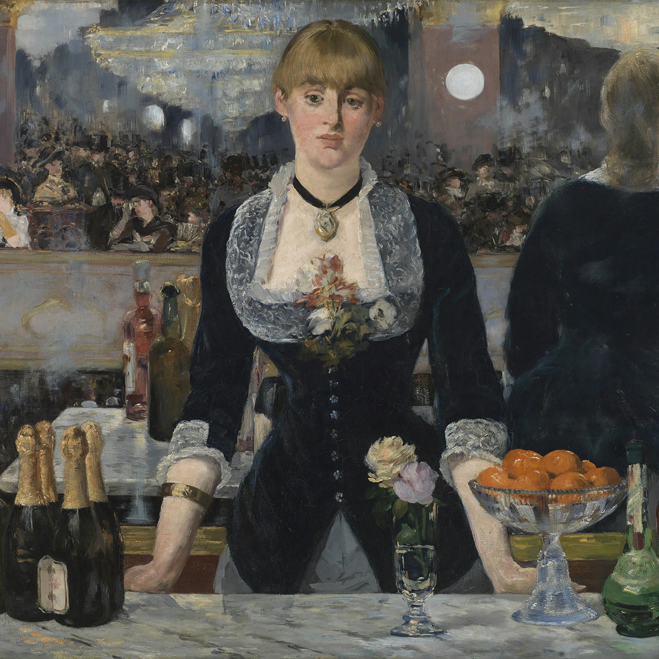 本展で目玉となるのは、エドゥアール・マネの代表作のひとつで、死の前年に描かれた《フォリー=ベルジェールのバー》(1882)だ。「フォリー=ベルジェール」は当時人気を博していたミュージックホールの名前。画面の大半を鏡の中の世界が占めており、表情が読み取れない女性の表情や、大きく右にずれたその後ろ姿など、発表当時から賛否を呼んだ作品だ。