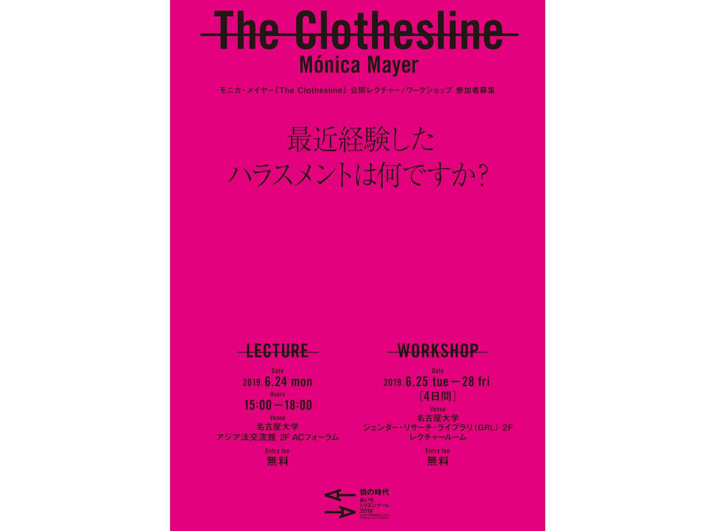 まず、6月24日の公開レクチャーの前半では、モニカ・メイヤーが《The Clothesline》を制作した背景や、アートとフェミニズムがどのように変化してきたのか、40年に及ぶ活動をもとにレクチャーを行う。続く後半では、名古屋大学大学院人文学研究科准教授・長山智香子の進行のもと、アーティストの嶋田美子、名古屋大学大学院人文学研究科准教授の馬然(マー・ラン)、「あいちトリエンナーレ2019」芸術監督である津田大介の登壇者を交え、女性やマイノリティを取り巻く日本の状況についてディスカッションを通じ思考を深める。