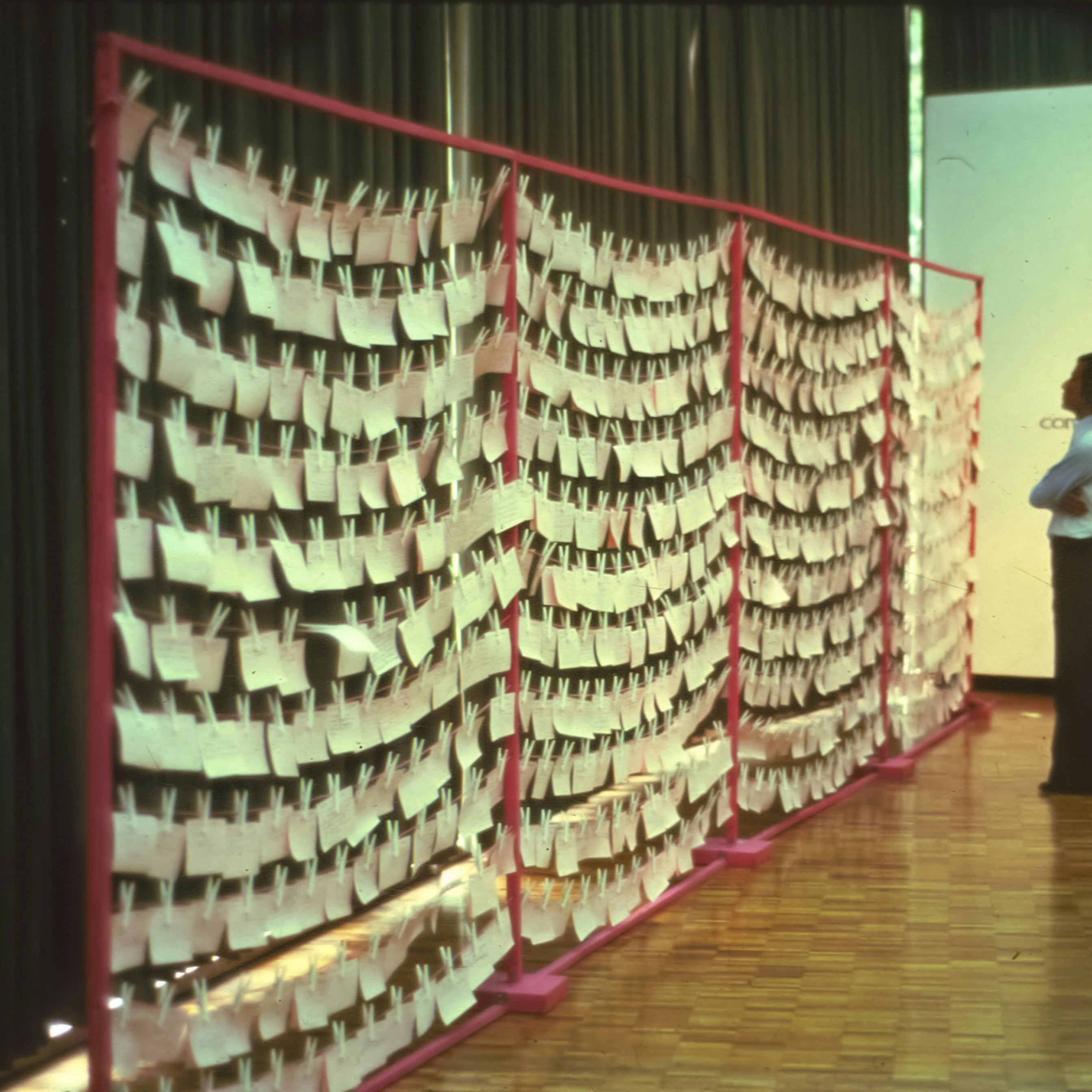 モニカ・メイヤーは1954年メキシコシティ生まれ。メキシコのフェミニスト・アートのパイオニア的存在で、ジェンダー間の不均衡を可視化する作品を数多く制作している。メイヤーが78年に始めた参加型プロジェクト《The Clothesline》は、参加者が日常生活で感じる抑圧やハラスメントなどをピンク色の紙に書き、物干しロープ(clothesline)に展示するというもの。各自の思いを告白するのに安全な環境を提供するとともに、社会構造から生じるダブル・スタンダードについて観客に気づきをもたらし、そこから対話や連帯が始まるきっかけをつくり出してきた。
