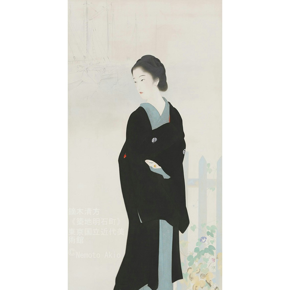 このうち《築地明石町》は帝国美術院賞を受賞し、清方を名実ともに日本を代表する画家のひとりに押し上げた作品で、モデルとなっているのは清方夫人の女学校時代の友人であった江木ませ子。水色のペンキが塗られた洋館の垣根や朝顔が描かれ、辺りは朝霧で白く霞んでいる。佃の入江に停泊した帆船のマストを背景に、髪をイギリス巻にし、単衣の小紋の着物に黒い羽織姿の女性像。本作は、清方が「明治20年代から30年代の人々の生活」というテーマに行き着いた、画業の後半のスタートラインに位置する作品だという。