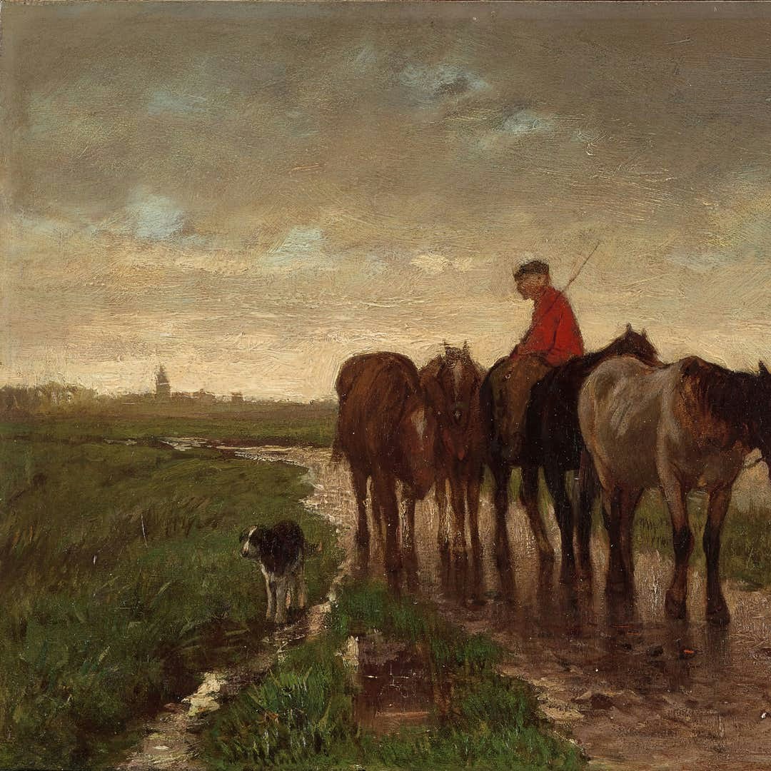 まず第1部では、ファン・ゴッホの親戚でハーグ派の主要画家であるアントン・マウフェの作品が出品される。ハーグ派とは、19世紀の後半にオランダ南西部の町・ハーグを中心に活動した画家たちのグループ。豊かな自然のなかで営む人々の素朴な暮らしを詩情豊かに描き出すことが特徴だ。ファン・ゴッホの最初の師匠でもあるマウフェによる《4頭の牽引馬》では、人や馬が川岸や運河に沿って舟を引く「引き舟道」といったオランダでは馴染み深い風景が描かれている。