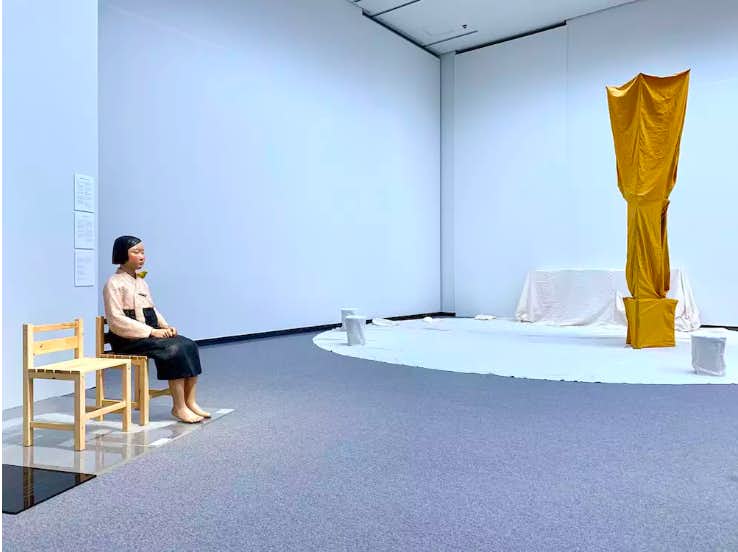 「表現の不自由展・その後」の展示風景より、左が《平和の少女像》