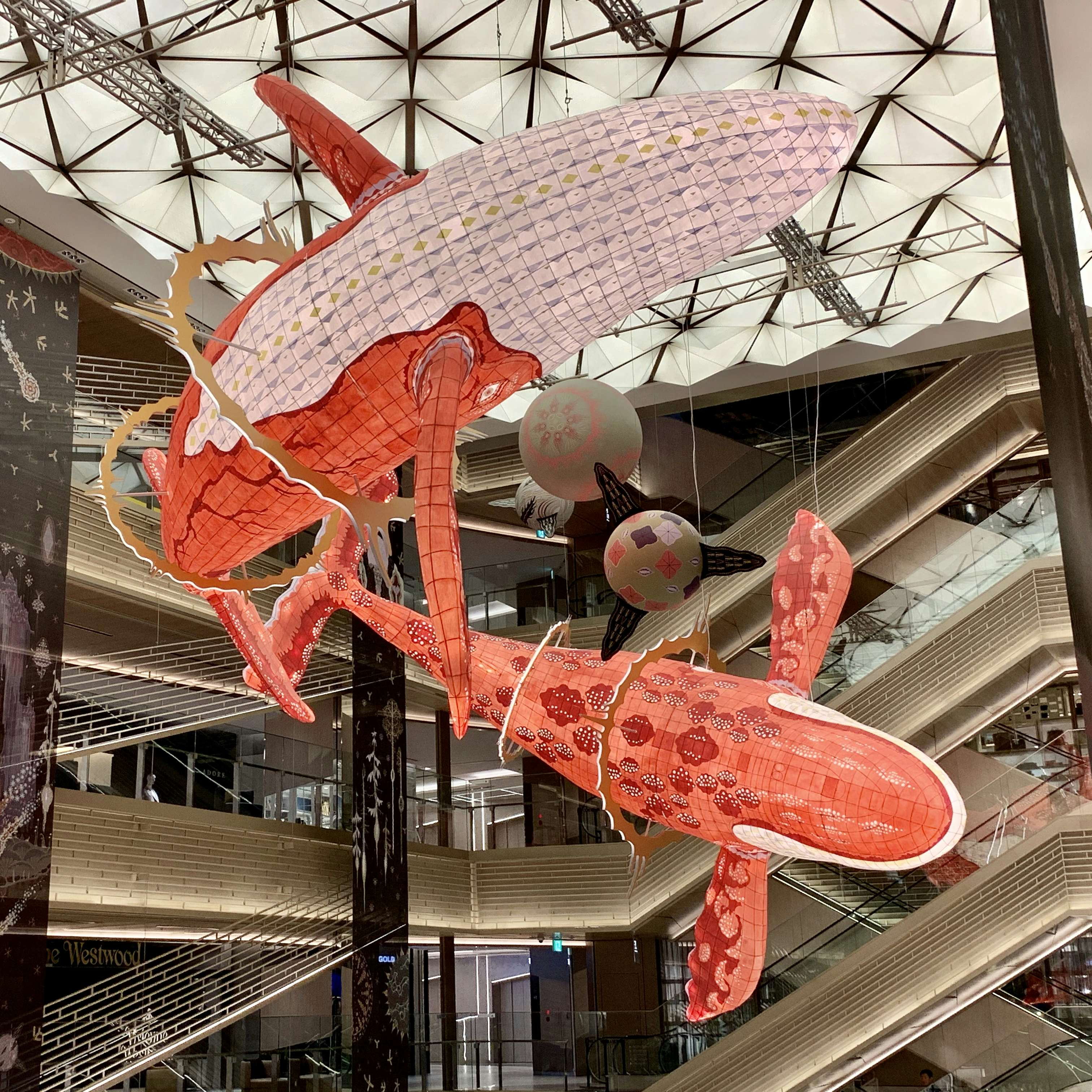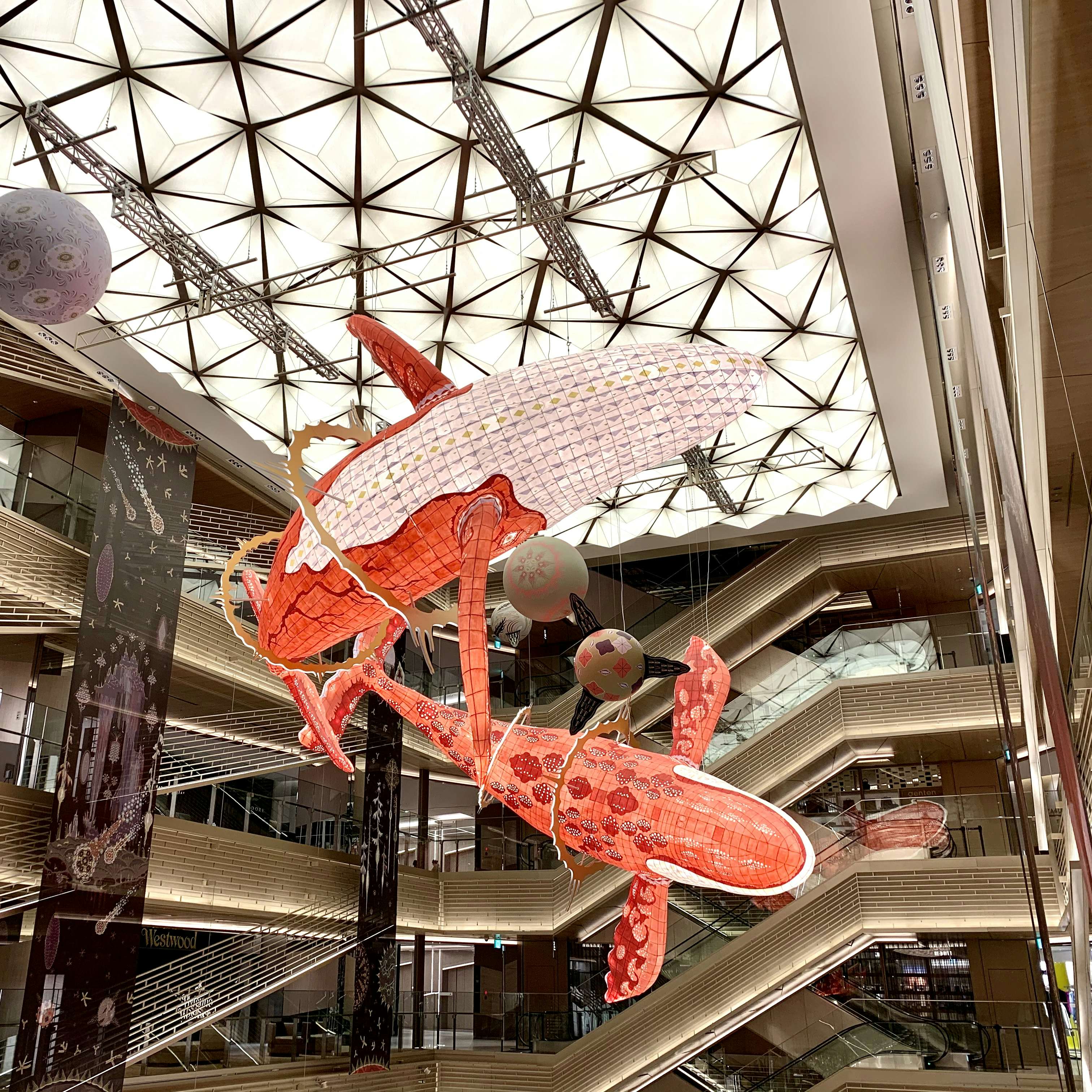 展示の中心となる中央吹き抜けには、《Astral Sea》に登場する時空を超えて宇宙を旅する全長10メートルもの《Lightning Whales》(ライトニング・ホエール)が登場。この《Lightning Whales》は、アイスランドの古い年代記に出てくる「Lyngbakr(リングバーク)」という巨大クジラにインスパイアされたものだという。青森・弘前のねぷた師が制作した2頭の鯨は、稲妻を噴き出しながら、円を描くようにGINZA SIXの宙を舞う。
