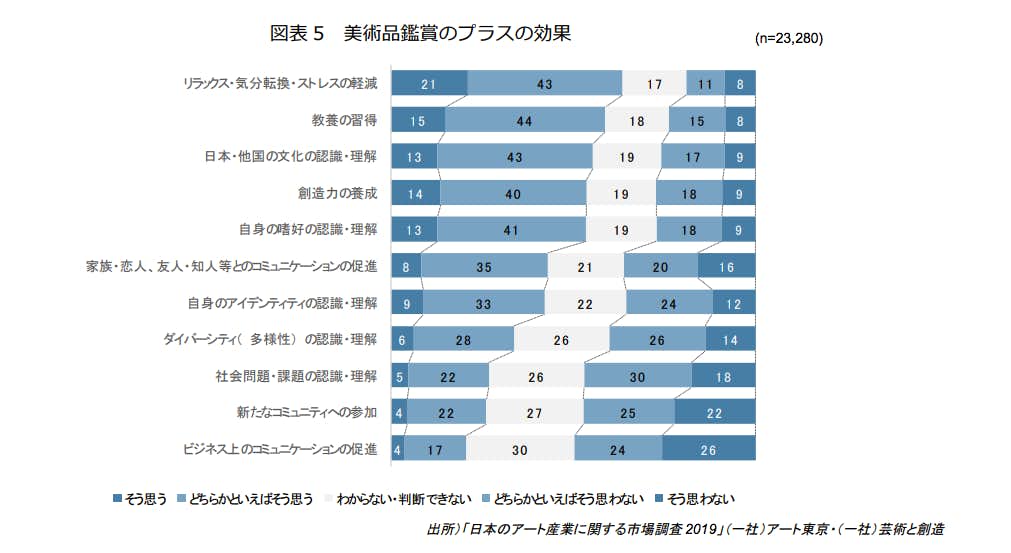 上記の調査に加え、今回の調査では「美術品鑑賞・購入の効果」も分析。人々が考える「美術品を鑑賞することによるプラスの効果」は「リラックス・気分転換・ストレス の軽減」(64パーセント)「教養の習得」(59パーセント)などの割合が高く、「日本・他国の文化の認識・理解」、「創造力の 養成」、「自身の嗜好の認識・理解」なども調査対象の半数以上が効果があると考えていることがわかった。