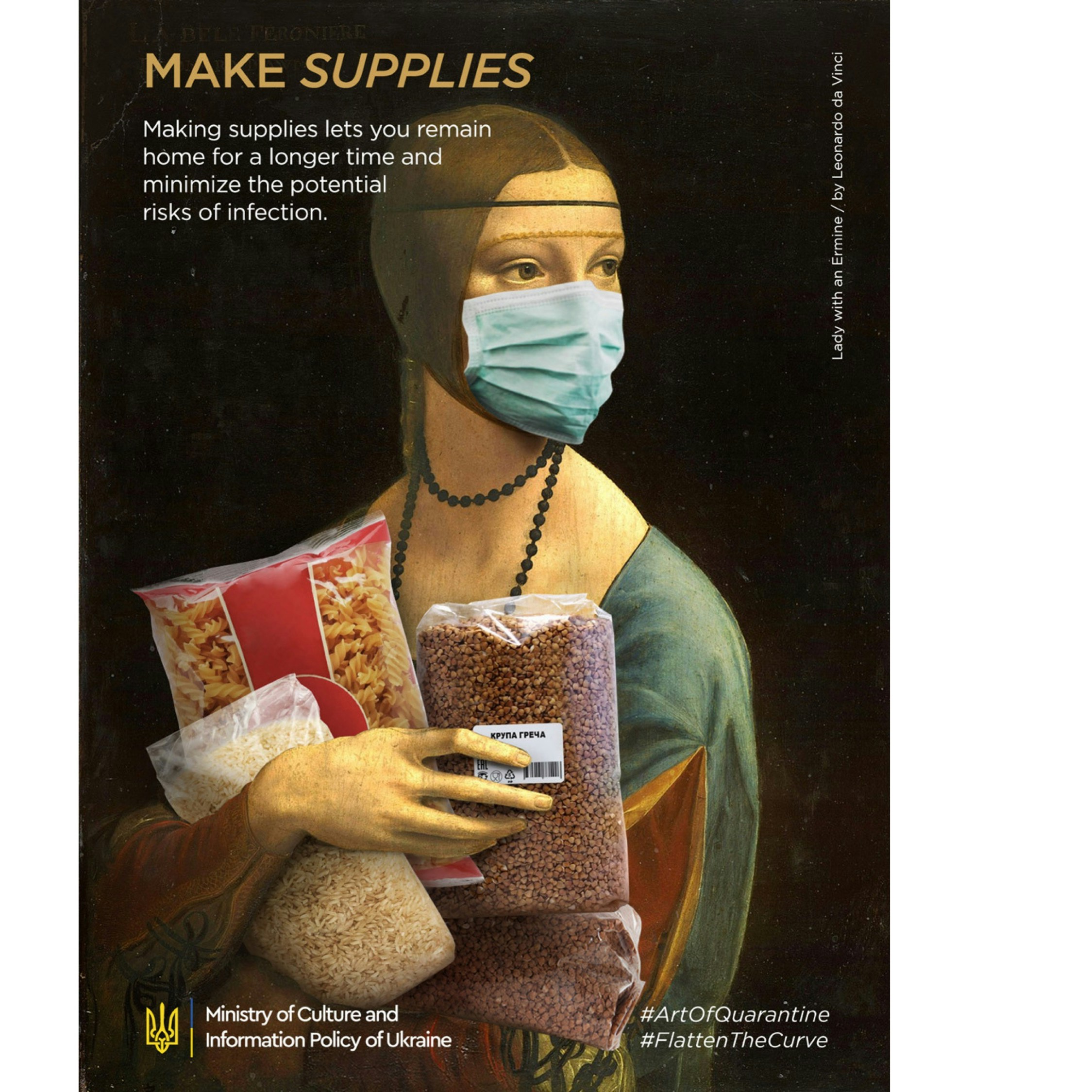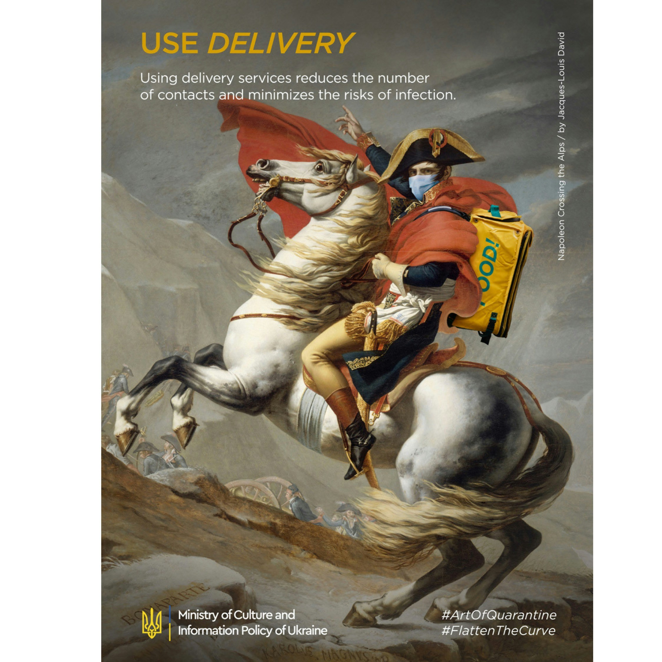 サン=ベルナール峠を越えるナポレオンが飲食配達員に変身し、レオナルド・ダ・ヴィンチが描いた貴婦人が白貂でなく、パスタやレンズ豆のパックを抱く。これらは、ウクライナの文化・情報セキュリティ省が始めたキャンペーン「Art of Quarantine(検疫のアート)」のポスターだ。