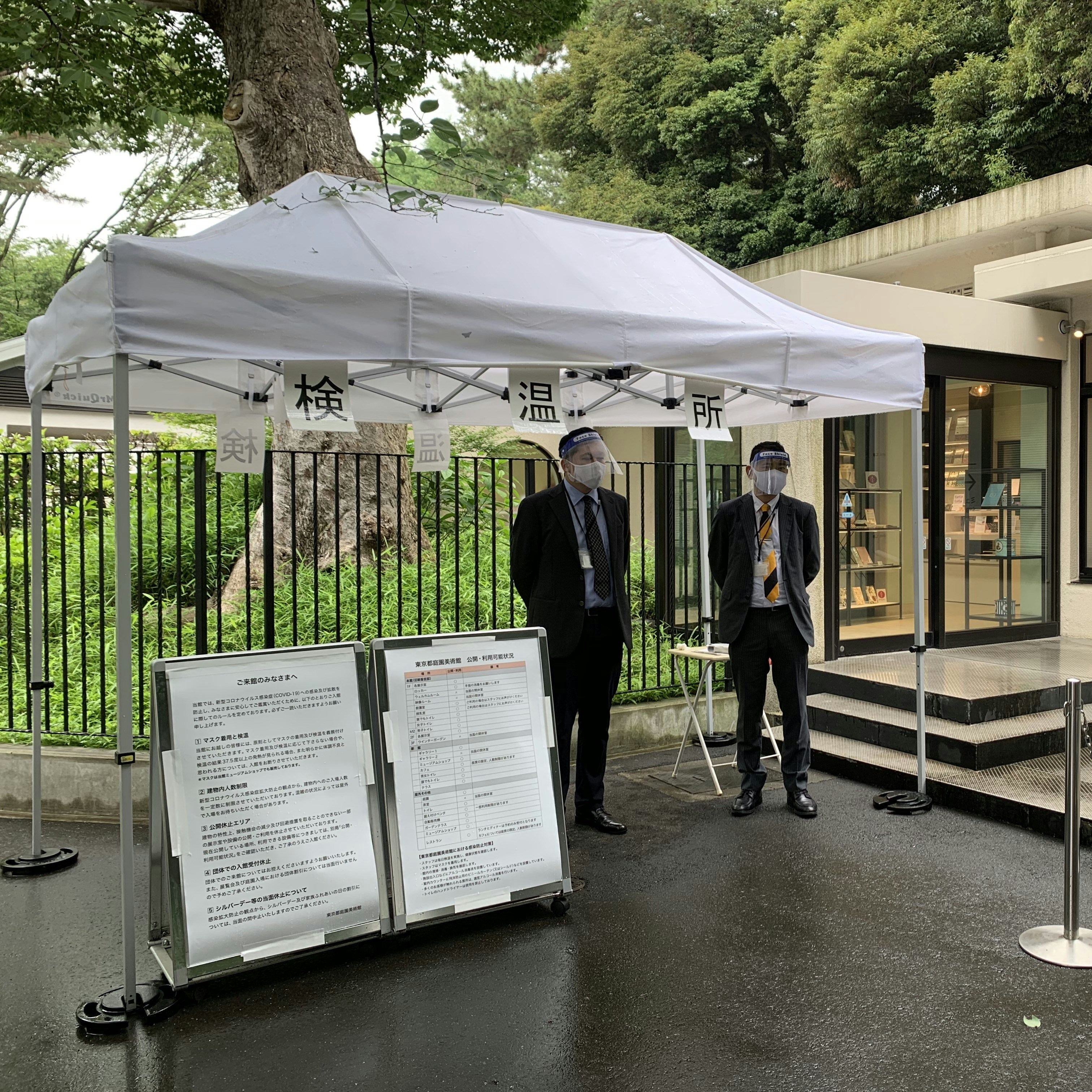 同館は再開にあたり、来場者のマスク着用や建物内の人数制限、手指消毒などの感染予防措置を実施。同日の午前中には、フェイスシールドとマスクを着用したスタッフが美術館のエントランスで来場者の検温を行う様子が見られている。