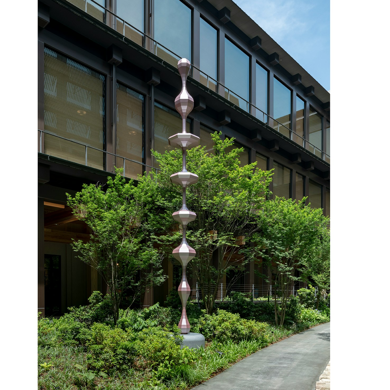 滴が地面に落ちて広がる様子を段階的に3Dモデル化し、上下反転させてランダムに積み重ねた作品で、全体が多面体で構成されており、自然光の変化に合わせて面から面へ、光が移り変わる。
