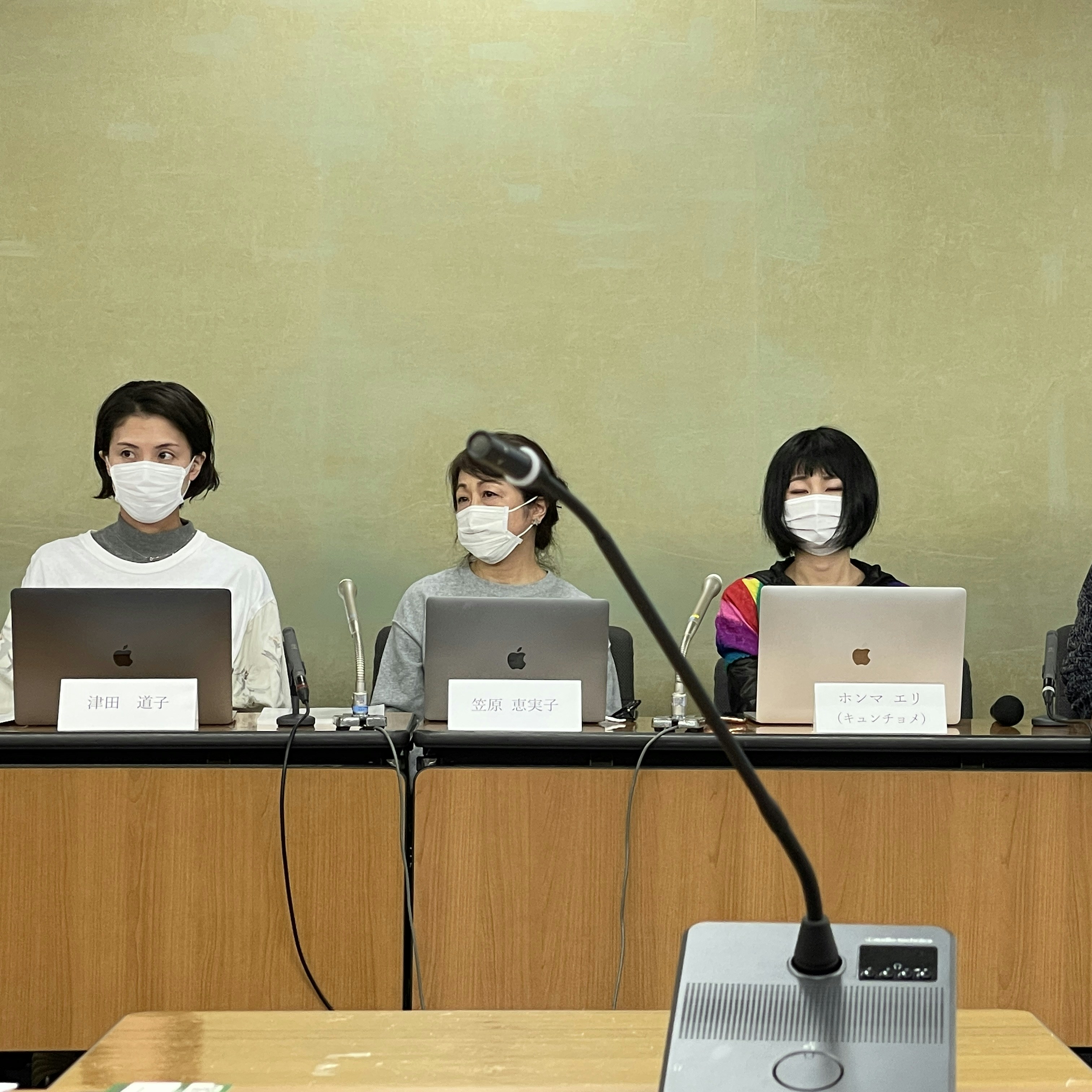 記者会見の様子。左から、津田道子、笠原恵実子、ホンマエリ、百瀬文