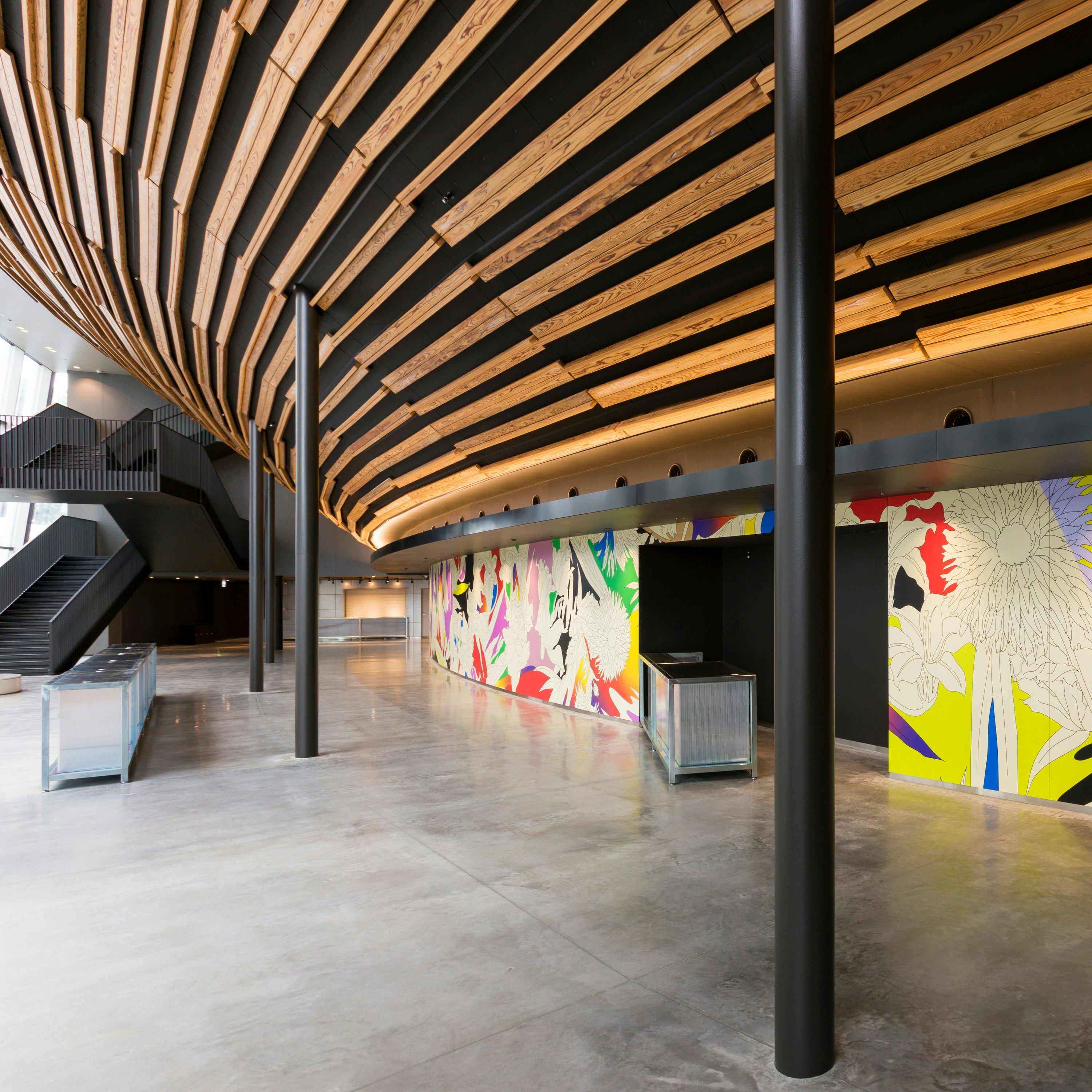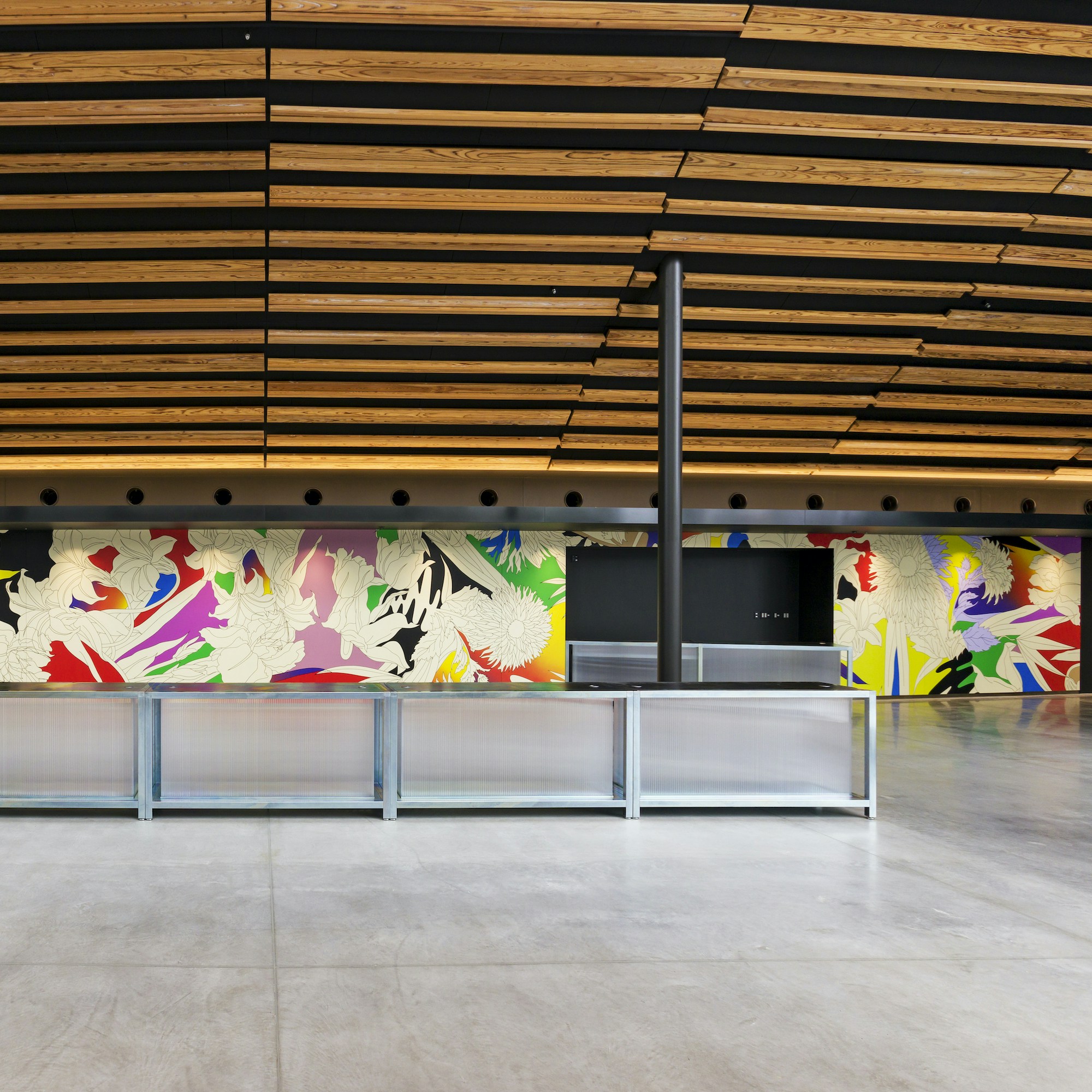 千葉競輪場跡地に建築された新しい競技施設「千葉JPFドーム」。そのメインエントランス側のホワイエスペースに、松山智一の作品が常設展示される。