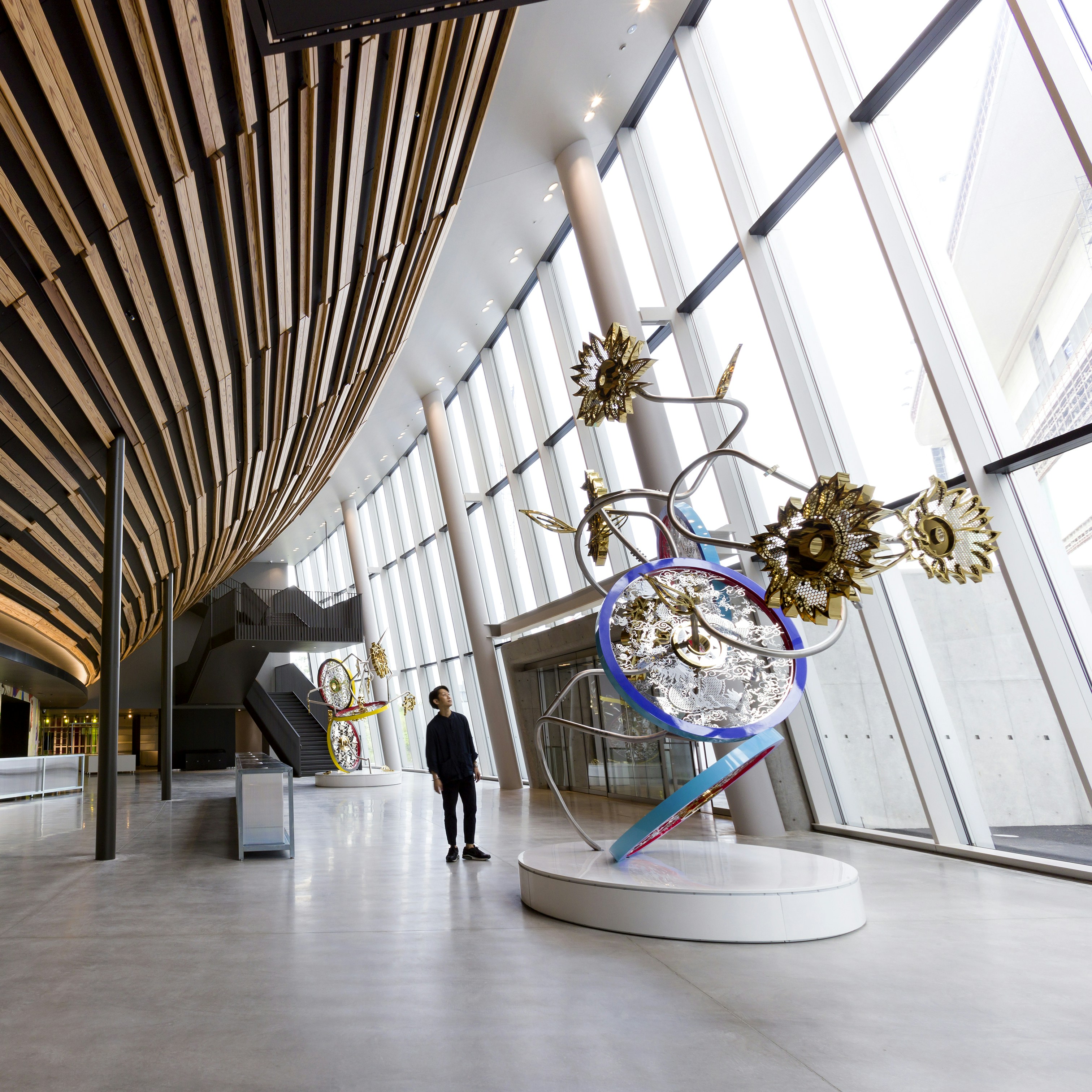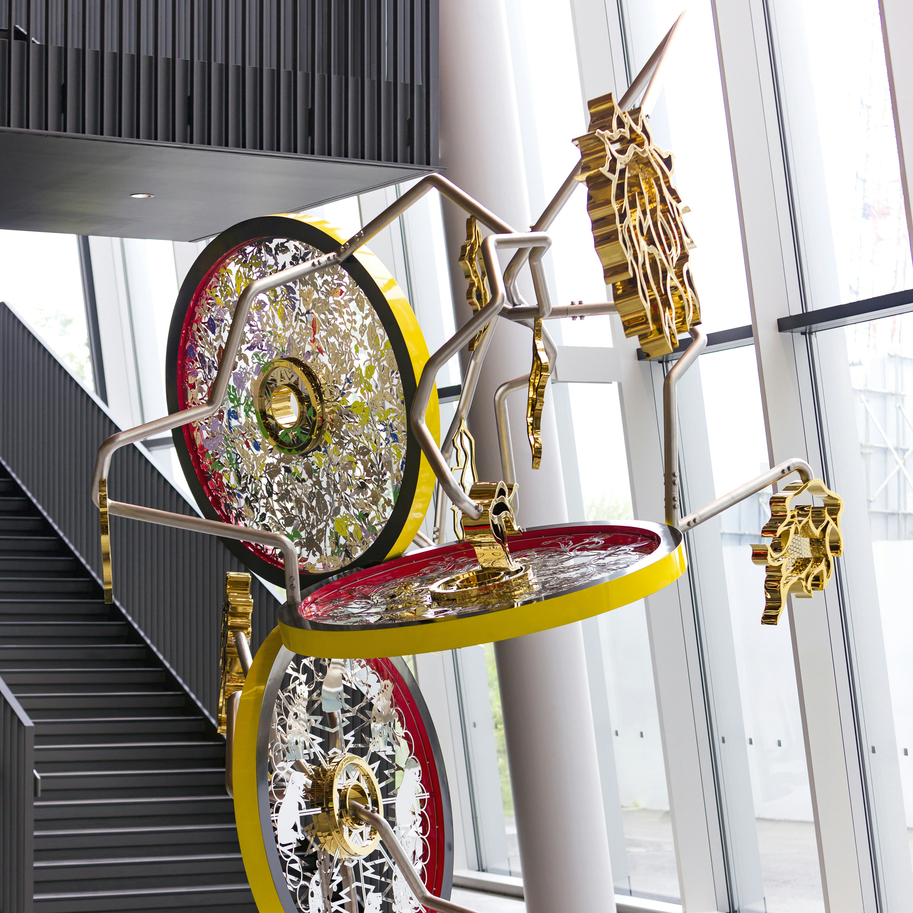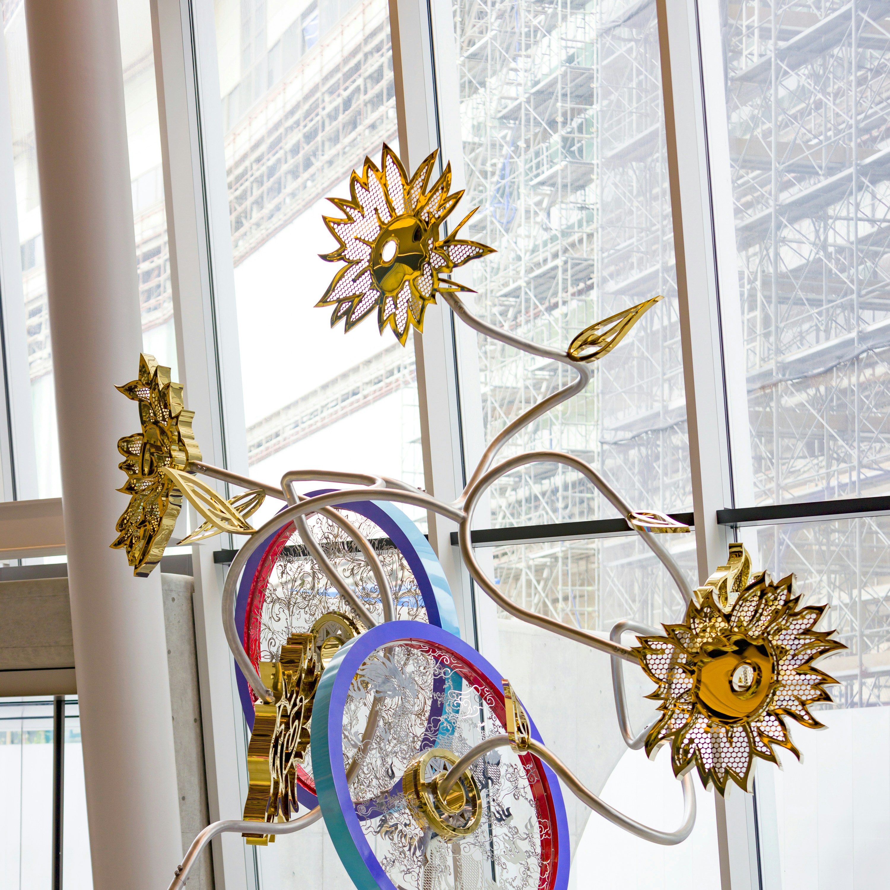この壁画の前に設置されたのが、高さ約4.5メートルの迫力ある彫刻《Glory Slowly》と《Immortality Morality》。それぞれ向日葵が咲き誇りと、枯れた向日葵がモチーフとなり、生命の表裏一体性を示した2作品には、月桂樹や中世の神格化された文様、験担ぎのアイコンなどからなる3つの輪の造形が組み込まれている。