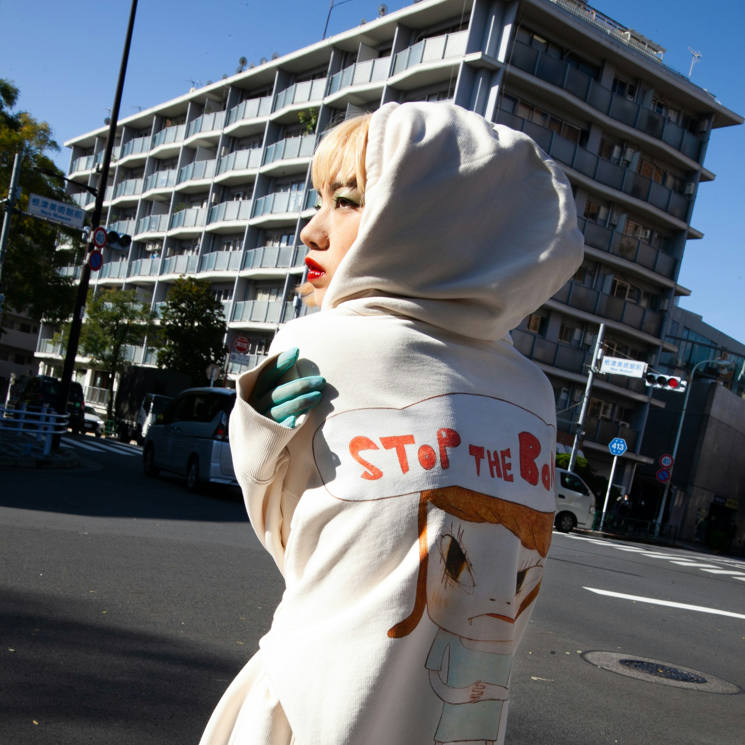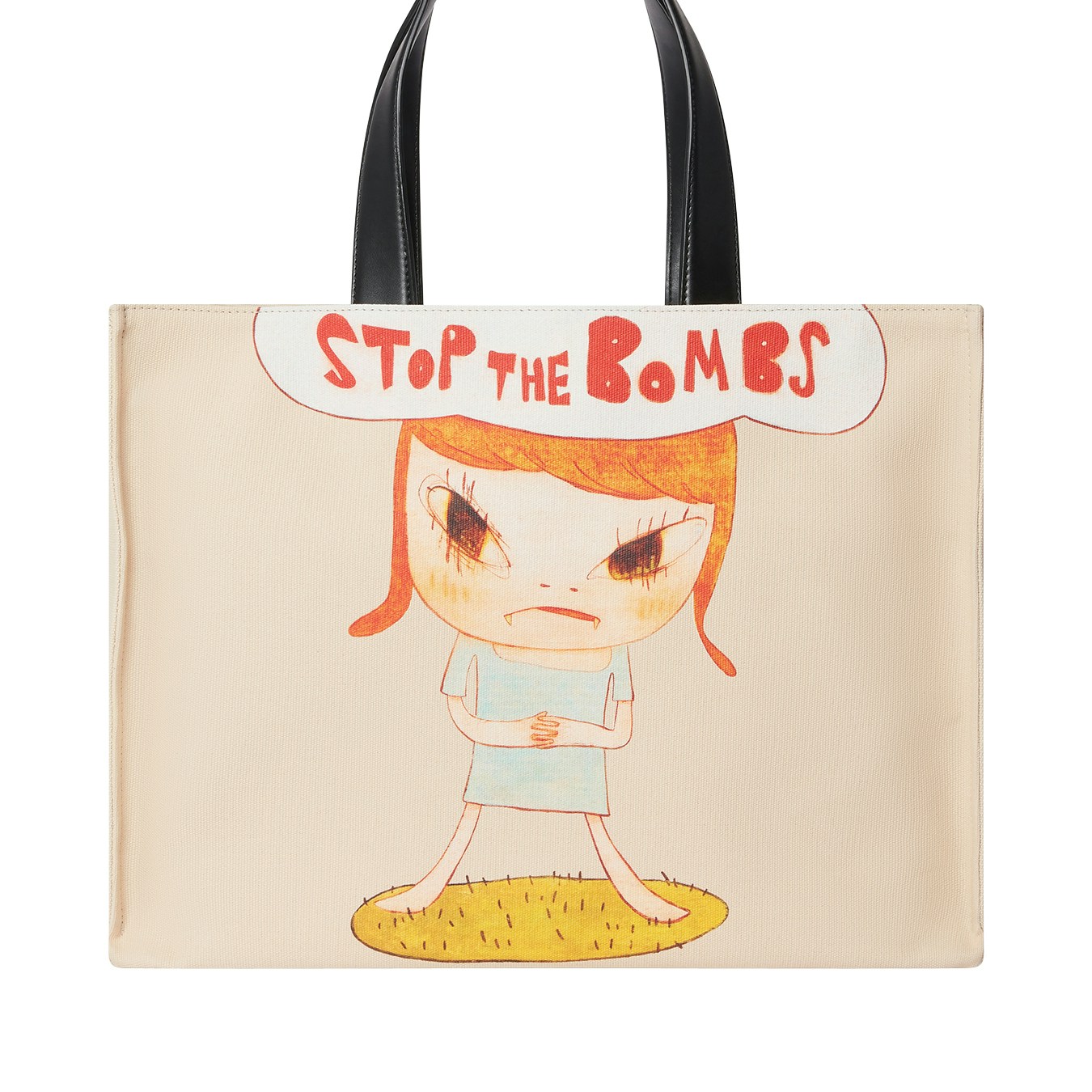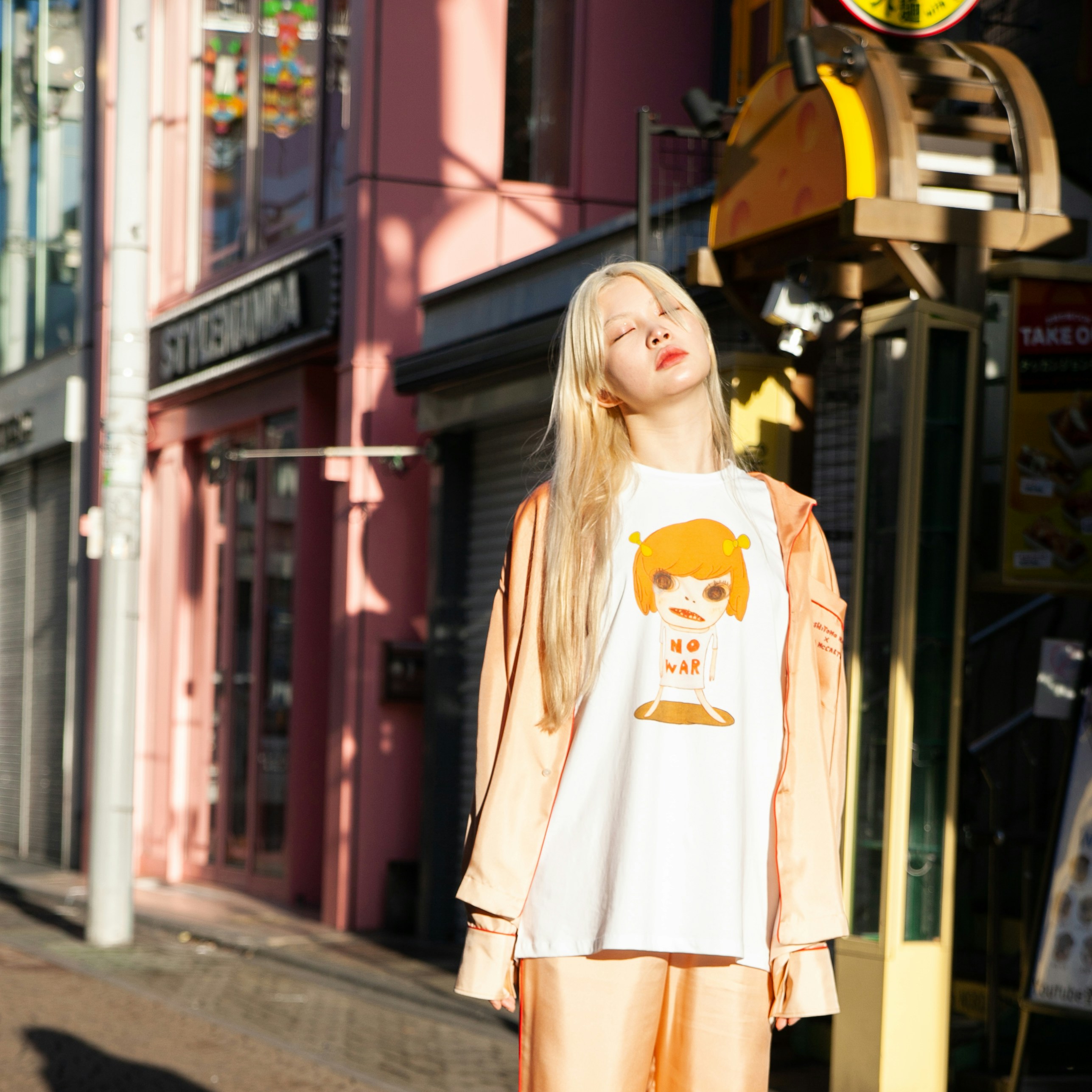 鋭い目つきの少女や動物に扮した子供たち、そして昨今の情勢を想起させる「STOP THE BOMBS」といった反戦メッセージなど、奈良の作品がオーガニックコットンのジャージーTシャツをはじめ、裏起毛のフーディやスウェットパンツ、バッグ、ワイドデニム、シルクのパジャマセットアップ、ダブルフェイスボンバージャケットなどに落とし込まれている。日本限定のバッグやシューズ、ハットなどの小物にも注目だ。