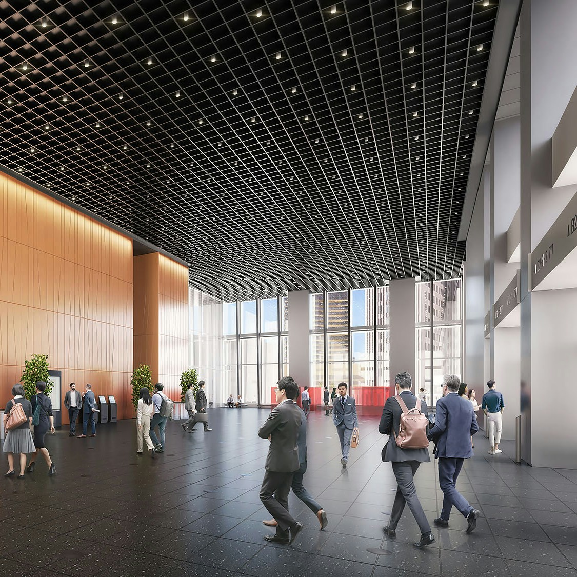 オフィスエントランス(イメージ)。奥にある赤い立体がラリー・ベルによる《Pinky》(イメージ)  ⒸDBOX for Mori Building Co., Ltd.