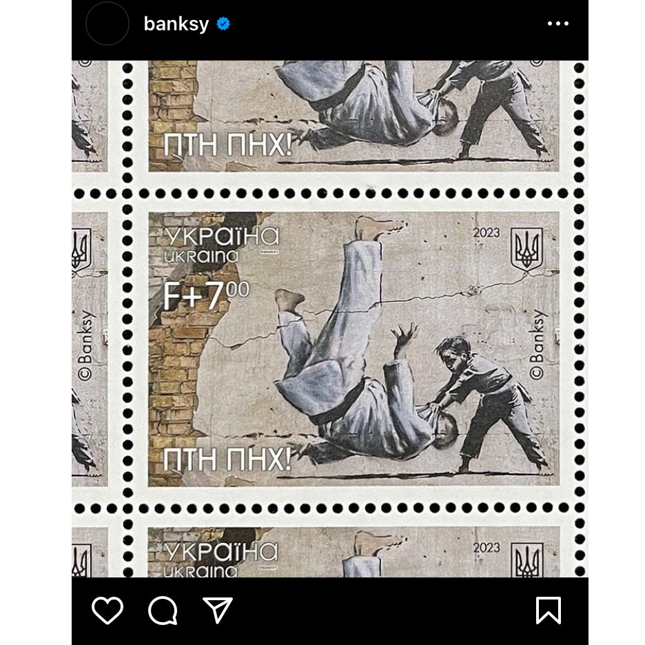 2月24日、ロシアの侵攻開始から1年を迎えるウクライナで、バンクシー作品の切手が発売された。バンクシーが自らのInstagramに写真を掲載した。