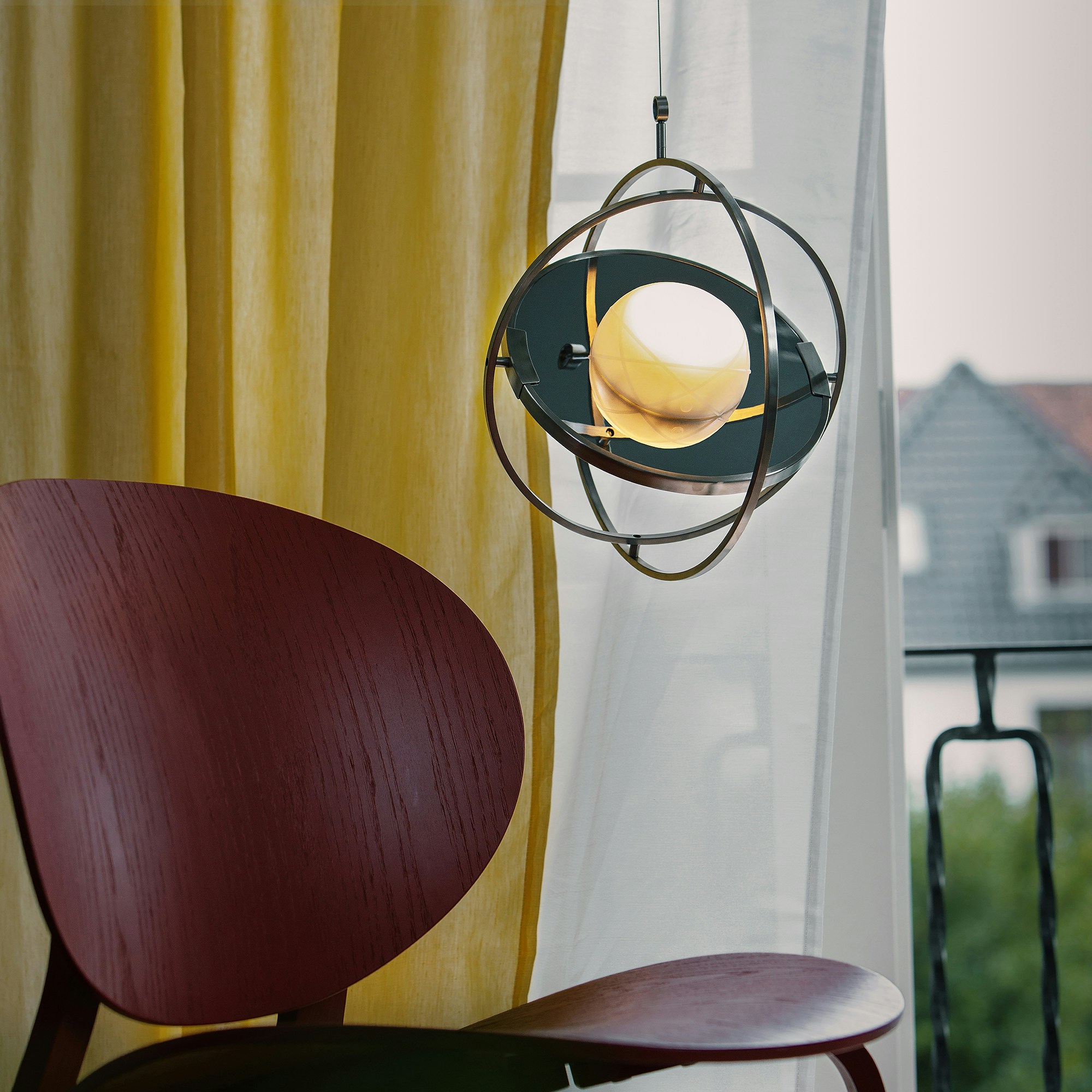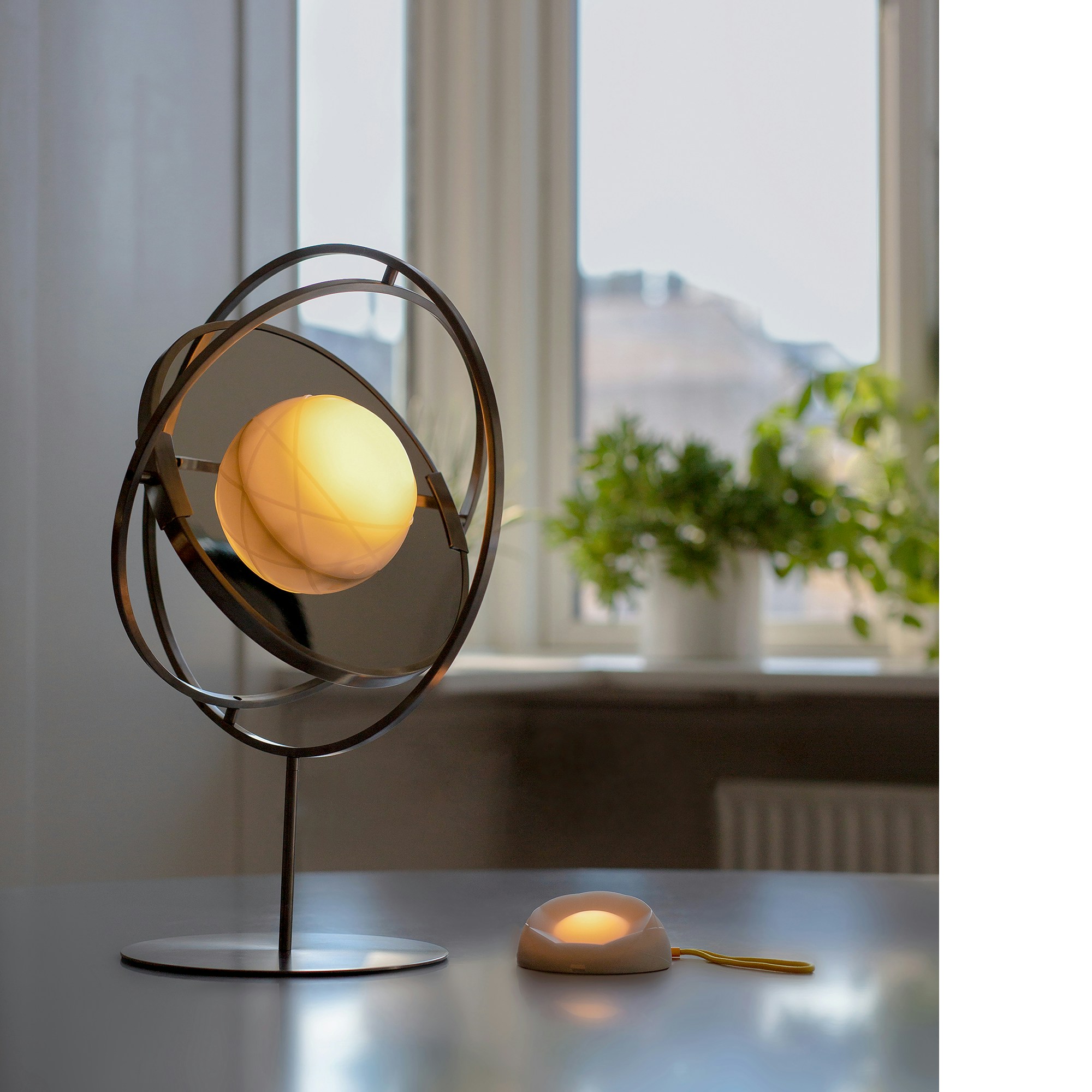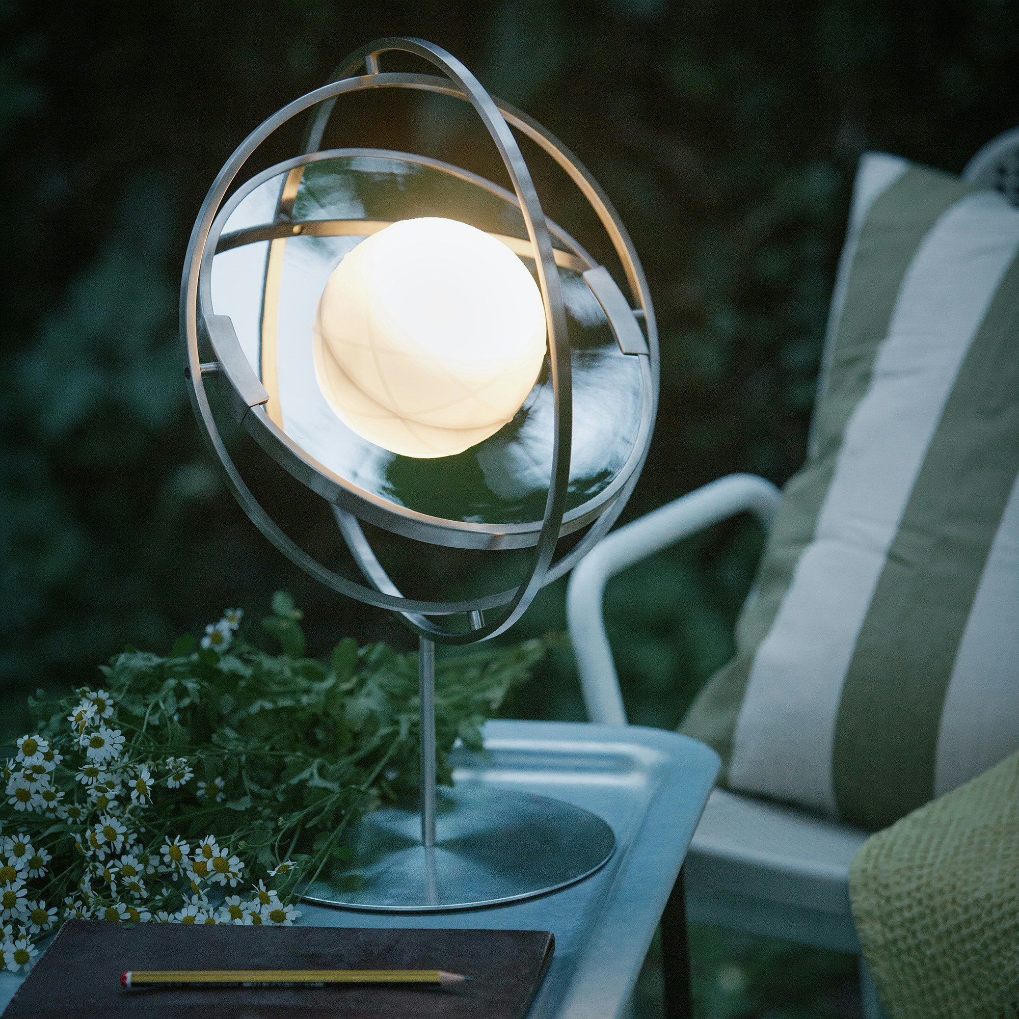 「SAMMANLÄNKAD/サマンレンカド LED 太陽電池式テーブルランプ」は、太陽のまわりを回る地球の軌道をインスピレーションにしてデザインされた照明。ジャイロスコープのようなフレームは、あらゆる角度に回転する仕様だ。またコードレスのため、ペンダントランプや懐中電灯、非常用モバイルバッテリーにもなり、場所や用途を限定することなくあらゆる場面を明るく照らすことができる。柔らかな光と明るい光をボタンで切り替えることも可能だ。