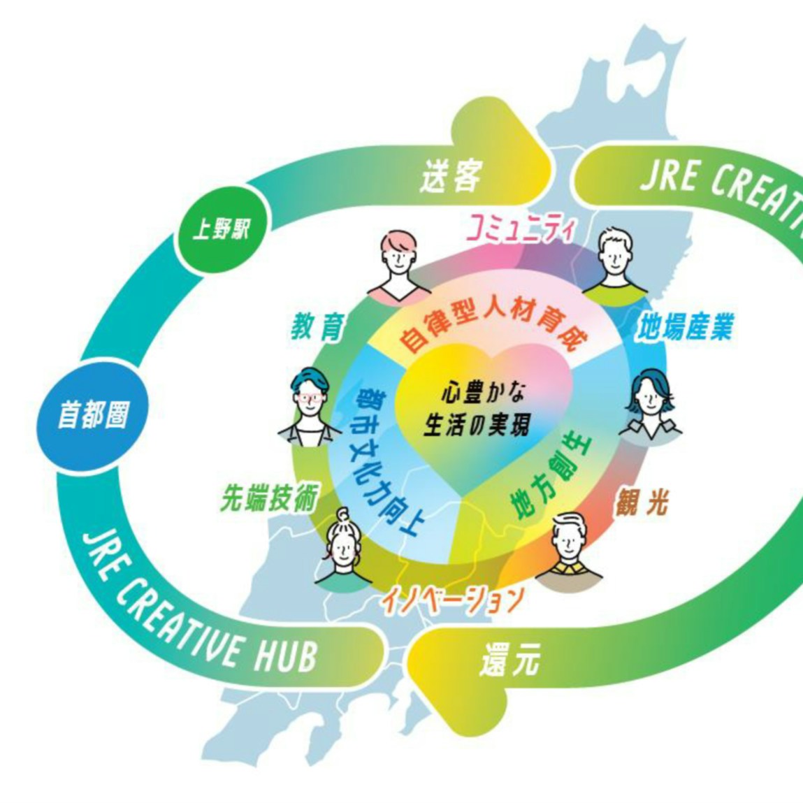 また、「アートによる文化創造」という面において、既に開発に着手している「TAKANAWA GATEWAY CITY」と連携を図り、「都市文化力の向上」をアートの側面からけん引。地方の拠点とも連携し、ものづくりや地場産業への支援、教育の視点を取り入れた取り組みを行い、生まれた商品や人材が首都圏に還元されるサイクルの構築を目指す。また、JR東日本の保有するアセットを活用し、「アート」を軸とした地域の盛り上げに寄与する。