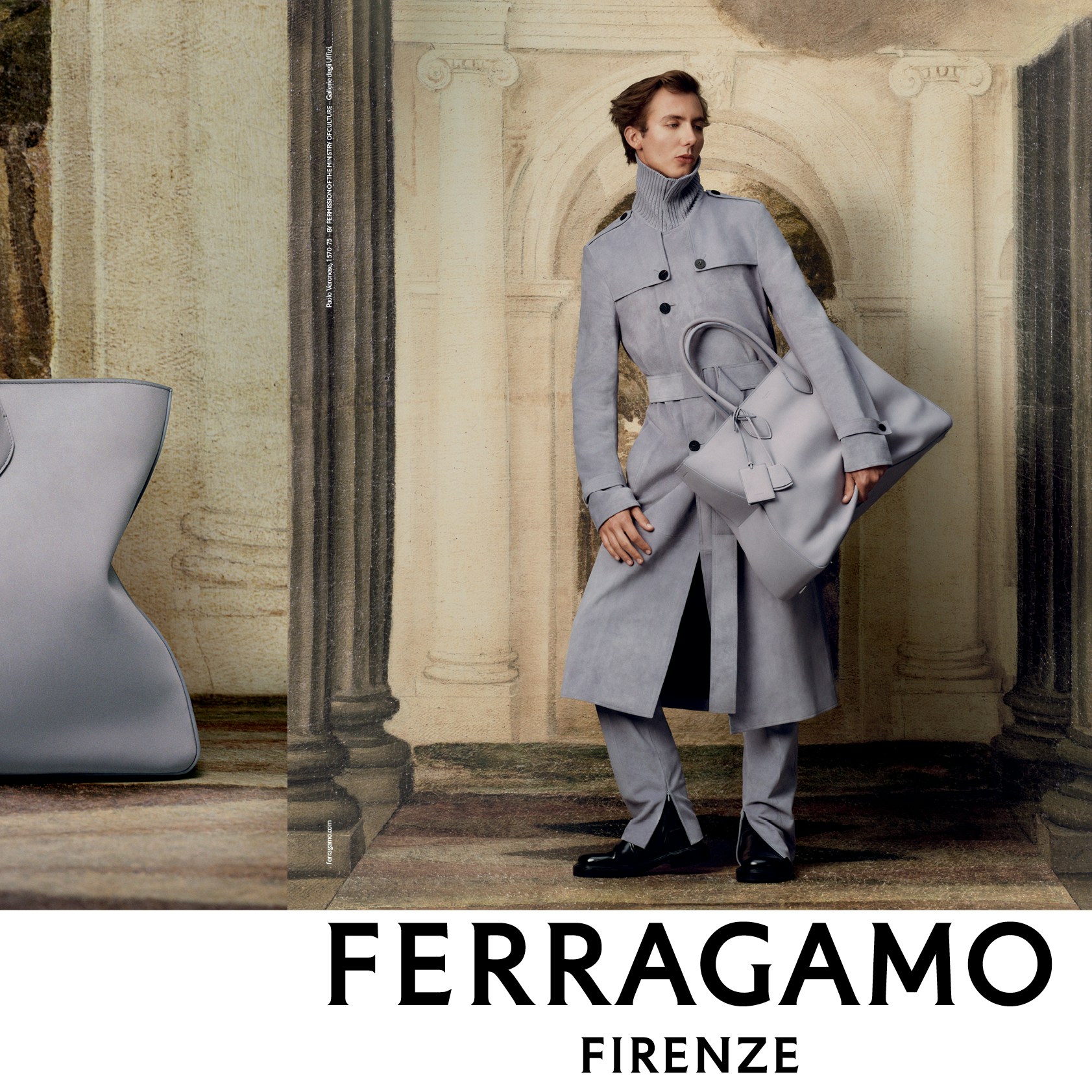 今回、クリエイティブ・ディレクターのマクシミリアン・デイヴィスがブランドの新しいビジョンを描くにあたり、フェラガモはウフィツィ美術館とのパートナーシップを締結。ベッリーニ、ヴェロネーゼ、ボッティチェリの作品のなかに、シャープなテーラリングや精巧なスーツ、豊かな質感のファブリック、大胆な素材や色使い、「ハグ」バッグ、アーカイヴにインスパイアされたゴールドのサンダルなどをまとった、ブランドのミューズやマクシミリアンの友人といった多様なクリエイティブ・コミュニティのメンバーを登場させた。