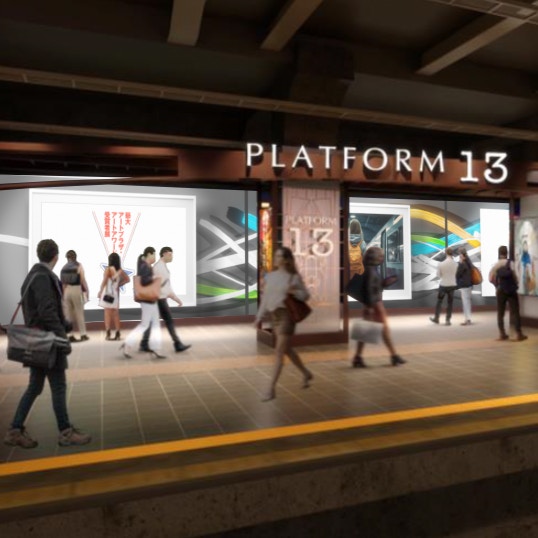 「PLATFORM13」では、全長約100メートルの13番線地平ホーム壁面にプロジェクターを用いて、デジタルアート映像を大きく投映。乗車客が気軽に芸術に触れあえる機会が創出される。今回は、全体のおよそ4分の1にあたる約25メートル分を先行開業。東京藝術大学などの協力のもと「藝大アートプラザ・アートアワード」デジタルアート部門の作品が投映される予定だ。