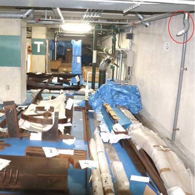 資料によると、どの作品にも複数の種類の粘着テープ・ステッカーが目立つ位置に直接貼り付けられており、剥がすと粘着剤が付着する状態。また錆も発生していた。この錆は外気吹き出しダクトの位置と関係しており、作品を2017年に咲洲庁舎10階から地下3階に移動させたタイミングで急激に進行したと考えられるという。地下駐車場の湿度・気温は作品にとっては不適切で、外気温湿度の変動が直ちに影響する状態だとしている。