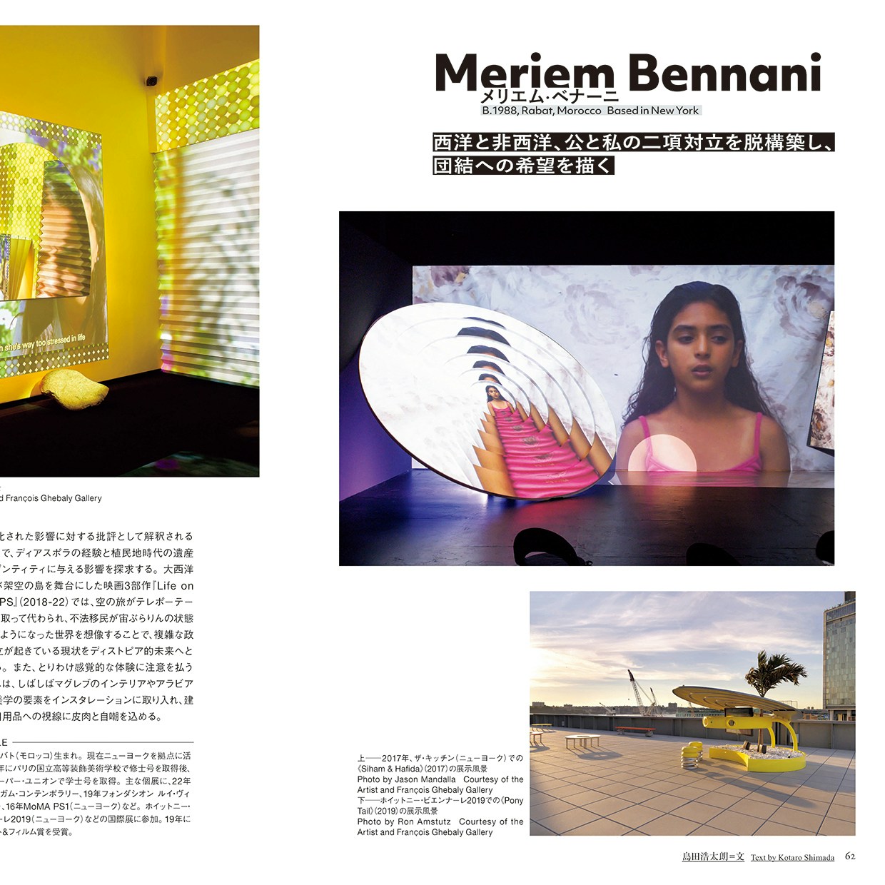 さらに、キュレーターの片岡真実(森美術館館長)とウンジー・ジュー(サンフランシスコ近代美術館キュレーター)による対談も掲載。多様性を受容する社会への大きな変化の潮流のただなかにある世界のアートシーンで求められる、アーティストやキュレーター、美術館の役割とはなにか? 様々な地域のアートシーンに関わり、グローバルにそしてローカルに活躍するふたりが語る、コンテンポラリー・アートの現在にも注目だ。