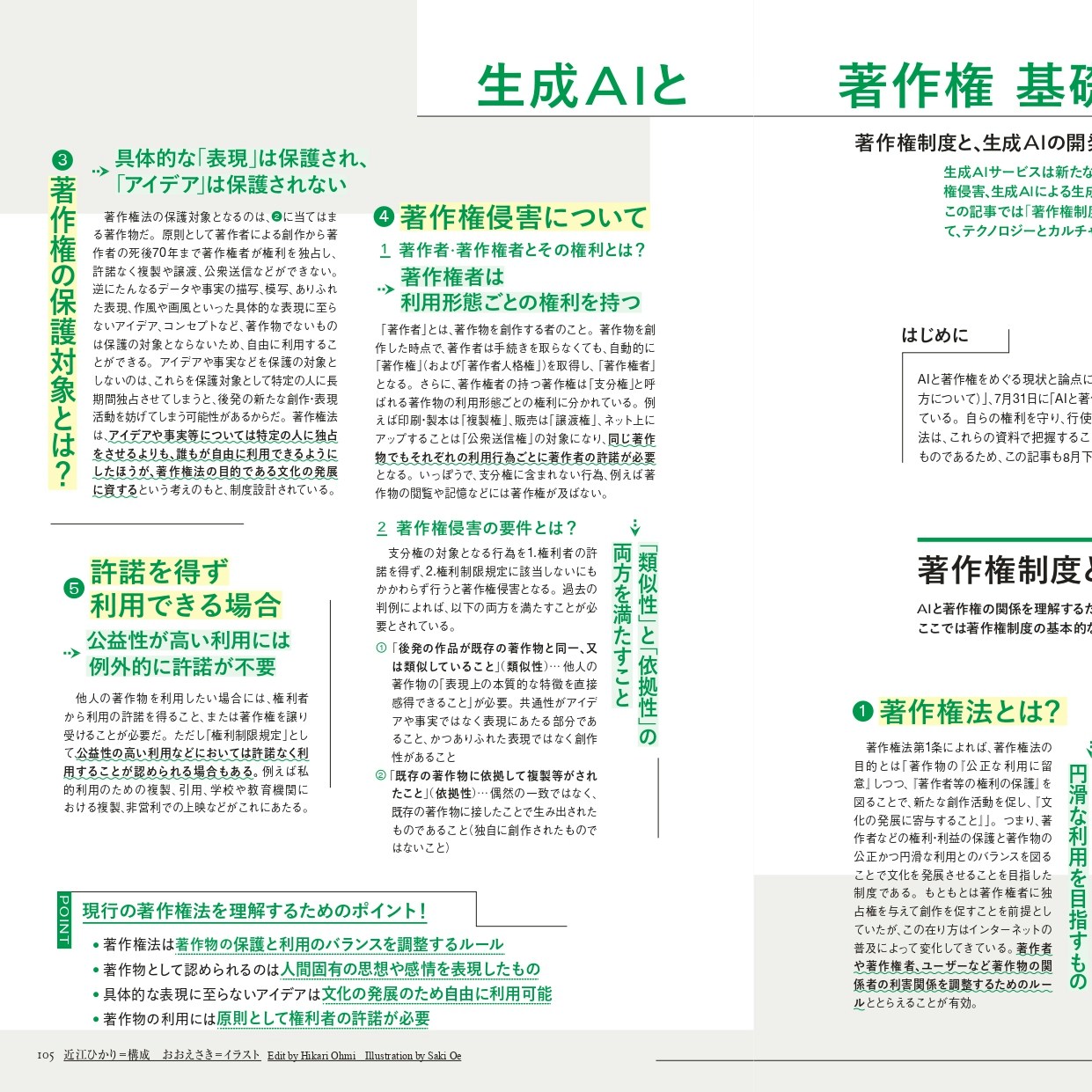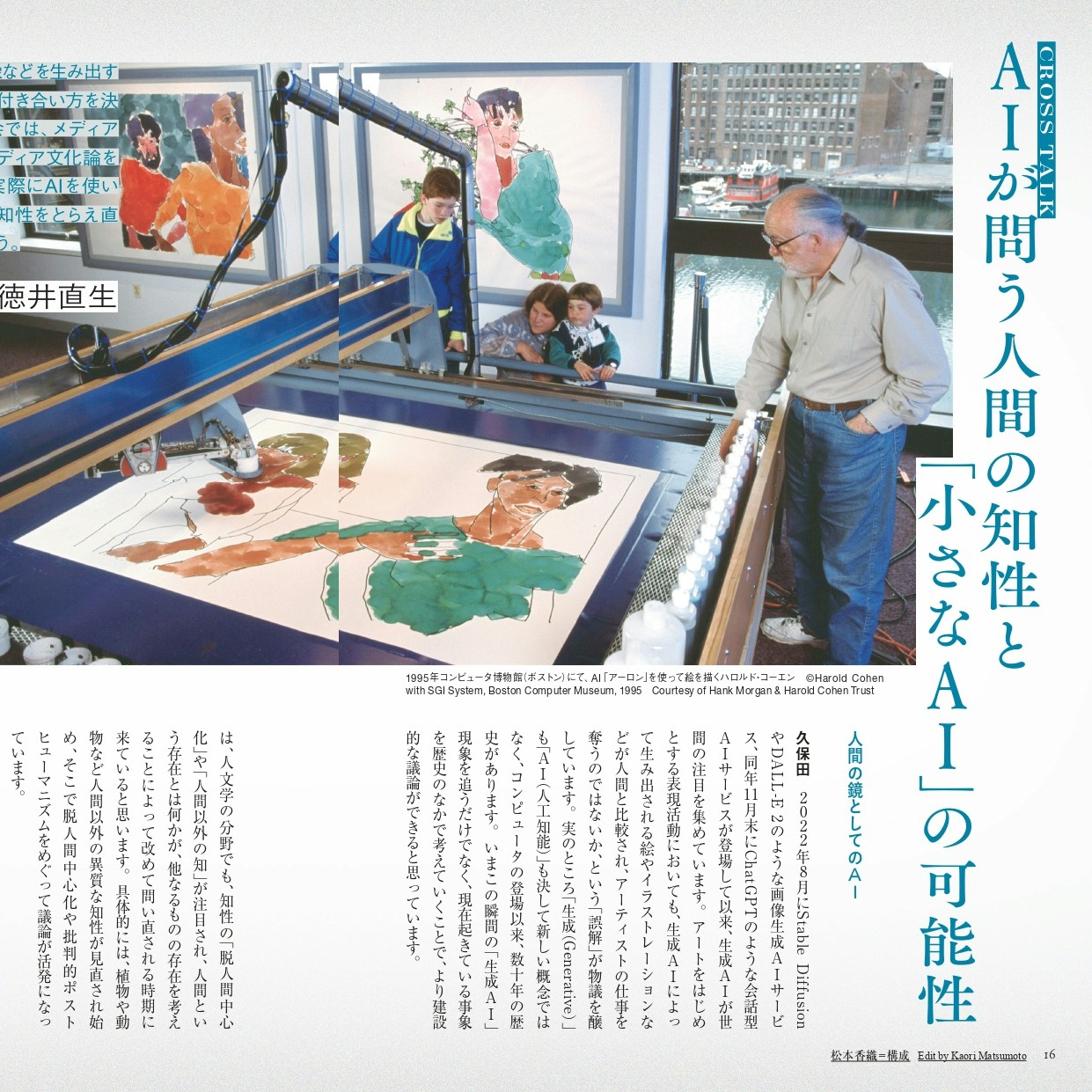 特集コンテンツには、朝倉世界一によるマンガ「AIとアーティスト」や、久保田晃弘×清水知子×徳井直生による座談会、トム・ホワイト、村山悟郎、ジェームズ・ブライドルへのインタビュー、AIと創造性にまつわる年表、生成AIと著作権をめぐる基礎講座なども掲載されている。